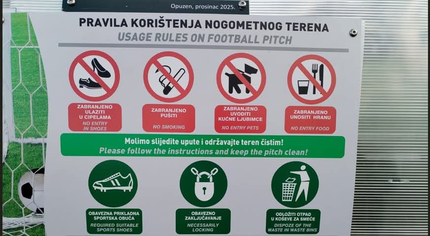 Posebno se ističe kako je zabranjen ulazak romobilima, biciklima i drugim vozilima na nogometni teren.