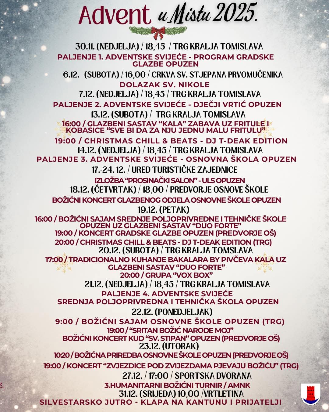 Opuzen i ove godine priprema posebno blagdansko vrijeme uz raznolik i sadržajan program manifestacije Advent u Mistu 2025. koji donosi niz kulturnih, glazbenih i zabavnih događanja za sve generacije.