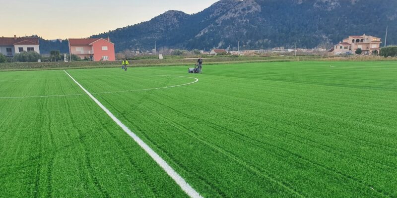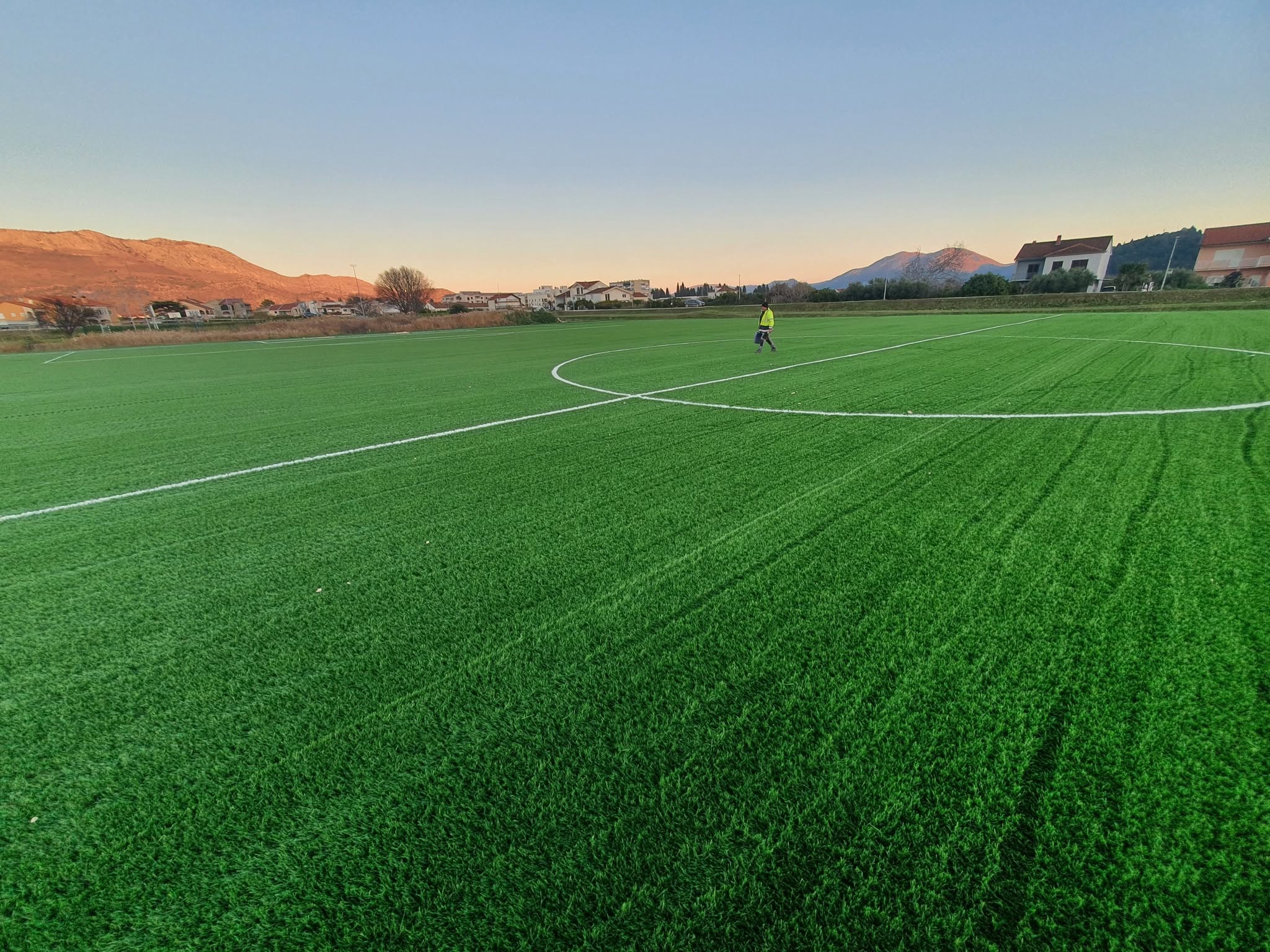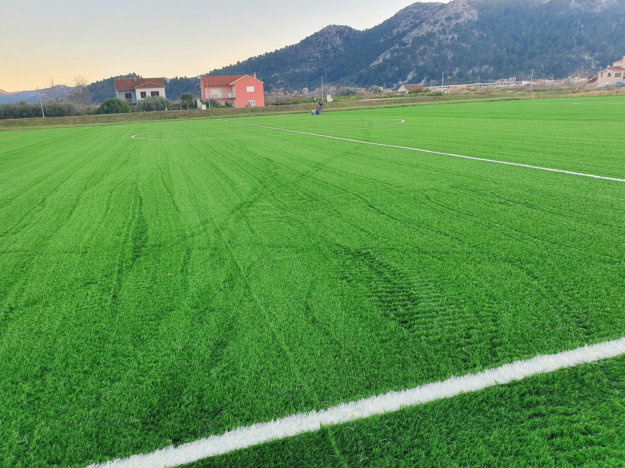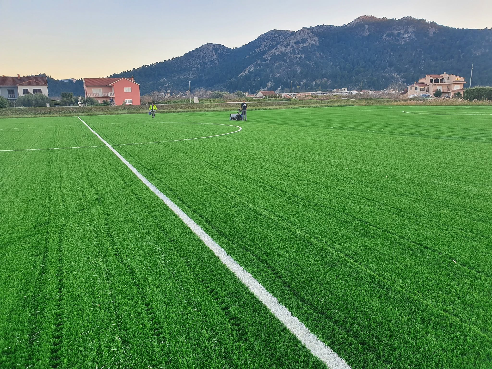 Stigao je dio sitnog pijeska, koji će se umetati u prethodno raščetkanu umjetnu travu – ukupno 180 tona. Također su postavljene spojne trake koje označavaju linije igrališta, čime je priprema terena dodatno napredovala.