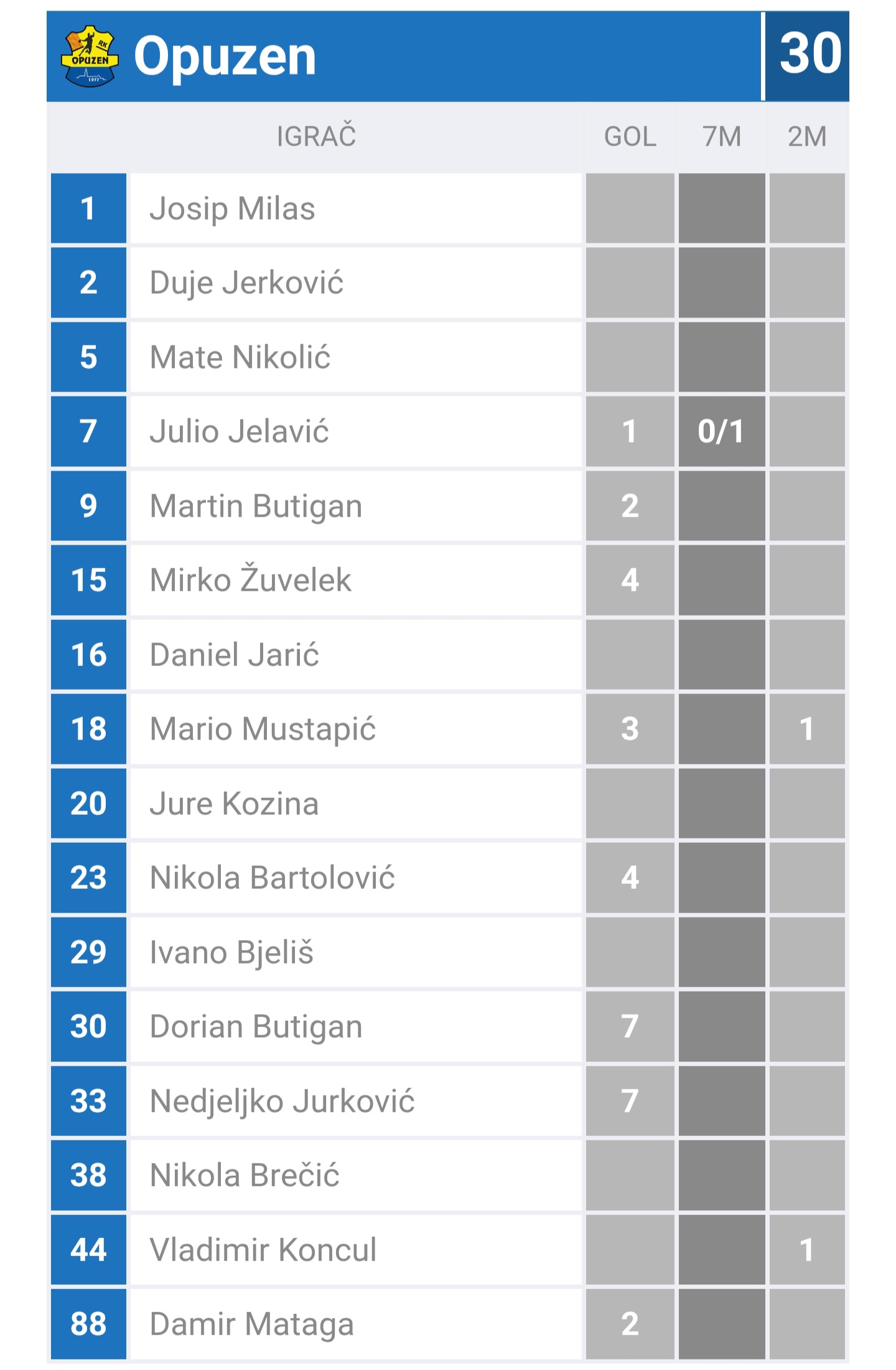 Opuzen su do pobjede predvodili Dorian Butigan i Nedjeljko Jurković sa po sedam pogodaka, dok su Mirko Žuvelek i Nikola Bartolović dodali po četiri gola.