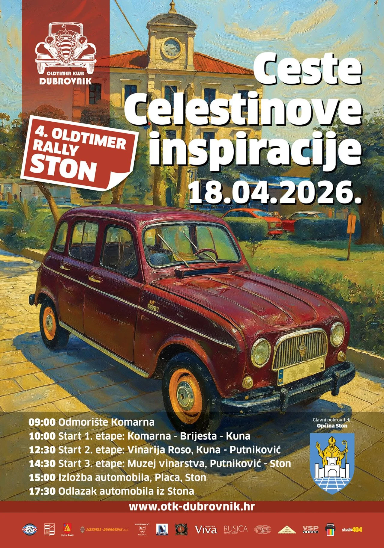 Oldtimer klub Dubrovnik organizira 4. OLDTIMER RALLY STON: Ceste Celestinove Inspiracije, koji će se održati u subotu, 18. travnja 2026. Start je u 10 sati s odmorišta Komarna na Pelješkom mostu odakle će osamdesetak oldtimera odvesti prvu etapu do Kune gdje će automobili biti izloženi ispred Vinarije Roso, nasuprot Perivoja Celestina Medovića.