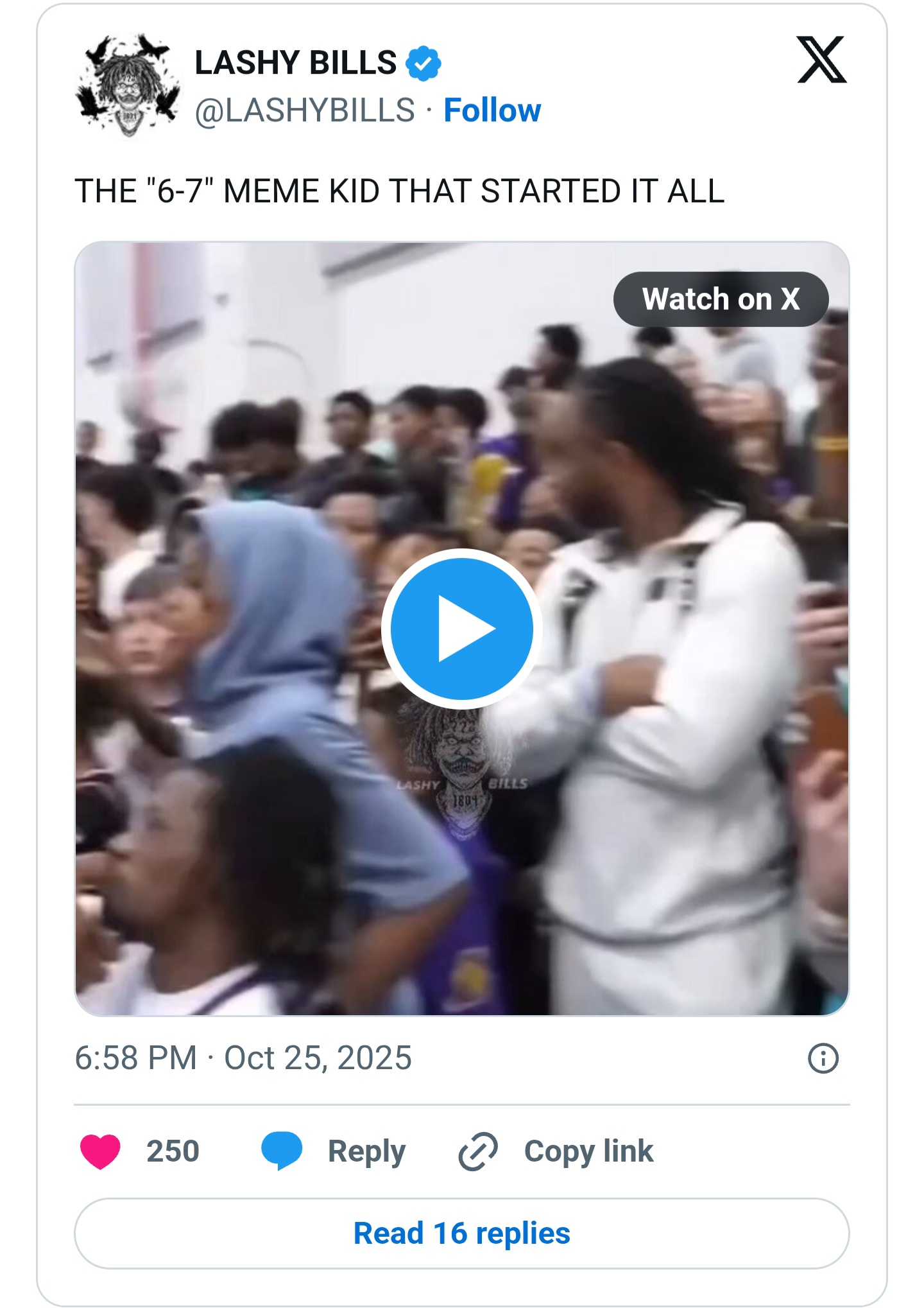 Nakon što se dio iz te pjesme pojavio kao podloga u mnogim TikTok videima, nekako se ‘zalijepio‘ i postao popularan, a čitava je stvar eksplodirala kad se na društvenim mrežama pojavio kratki video snimljen na nekoj košarkaškoj utakmici u kojem se, na kraju akcije igrača, kamera okreće prema publici i neki klinac uzvikuje 6,7 mašući rukama na karakterističan način.