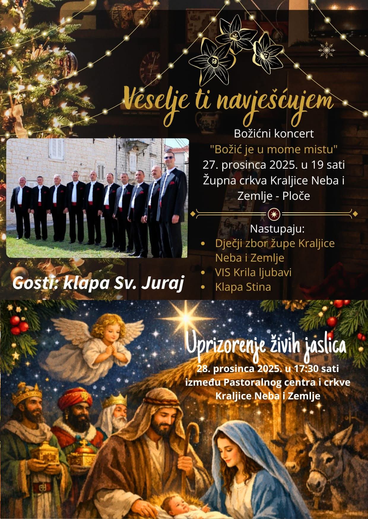 U subotu, 28. prosinca 2025. godine, s početkom u 17:30 sati, uslijedit će uprizorenje živih jaslica, koje će se održati na prostoru između Pastoralnog centra i crkve Kraljice Neba i Zemlje.