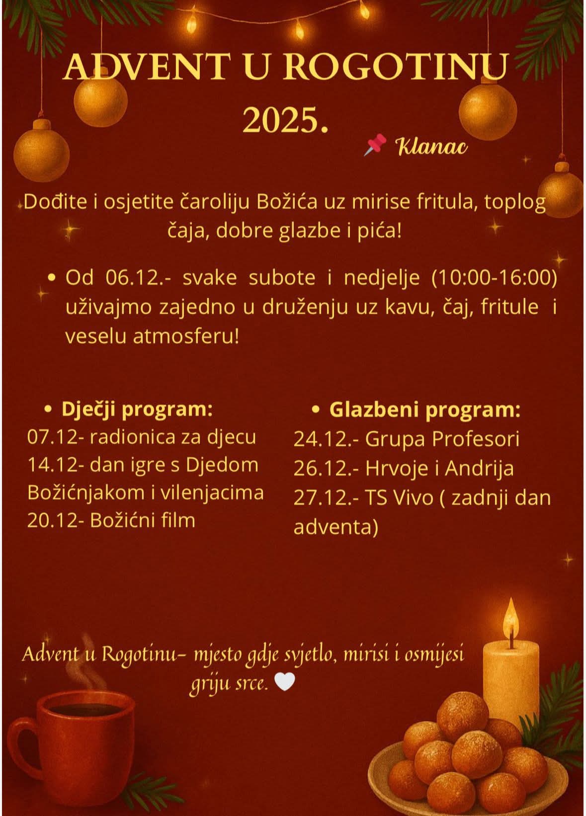 Udruga za očuvanje tradicijskih vrijednosti Rogotin najavila je još jedno izdanje rogotinskog Adventa, manifestacije koja je posljednjih godina postala omiljeno okupljalište mještana i njihovih gostiju. Na Klancu će se i ove zime spajati mirisi fritula, kobasica, toplog čaja i kave, uz prigodni dječji sadržaj i glazbeni program.