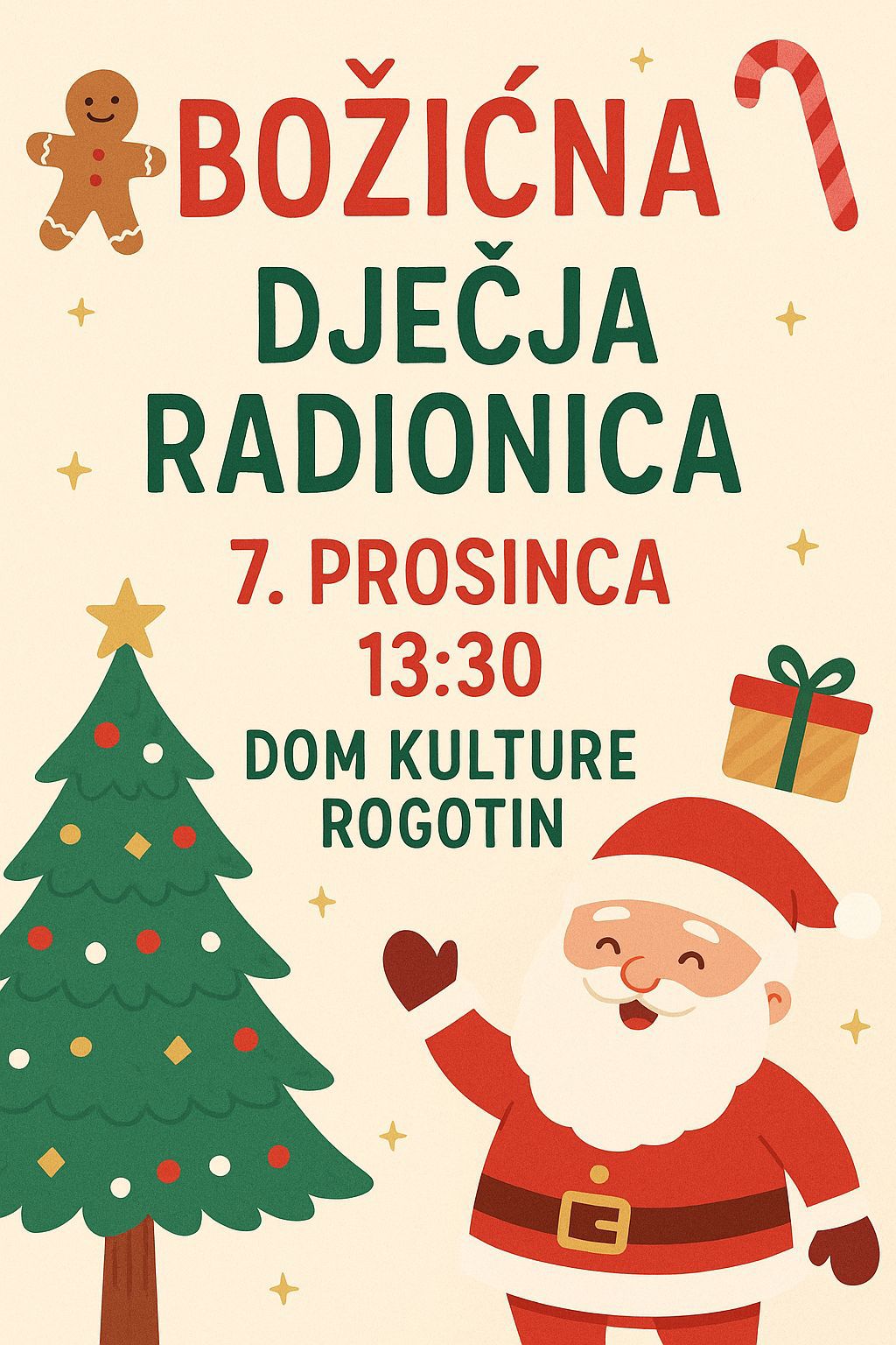 U sklopu rogotinskog Adventa danas će se održati božićna dječja radionica u Domu kulture u Rogotinu, s početkom u 13:30 sati. Riječ je o programu namijenjenom najmlađima, u kojem će djeca izrađivati blagdanske ukrase, sudjelovati u tematskim aktivnostima i pripremati se za nadolazeće božićne dane.