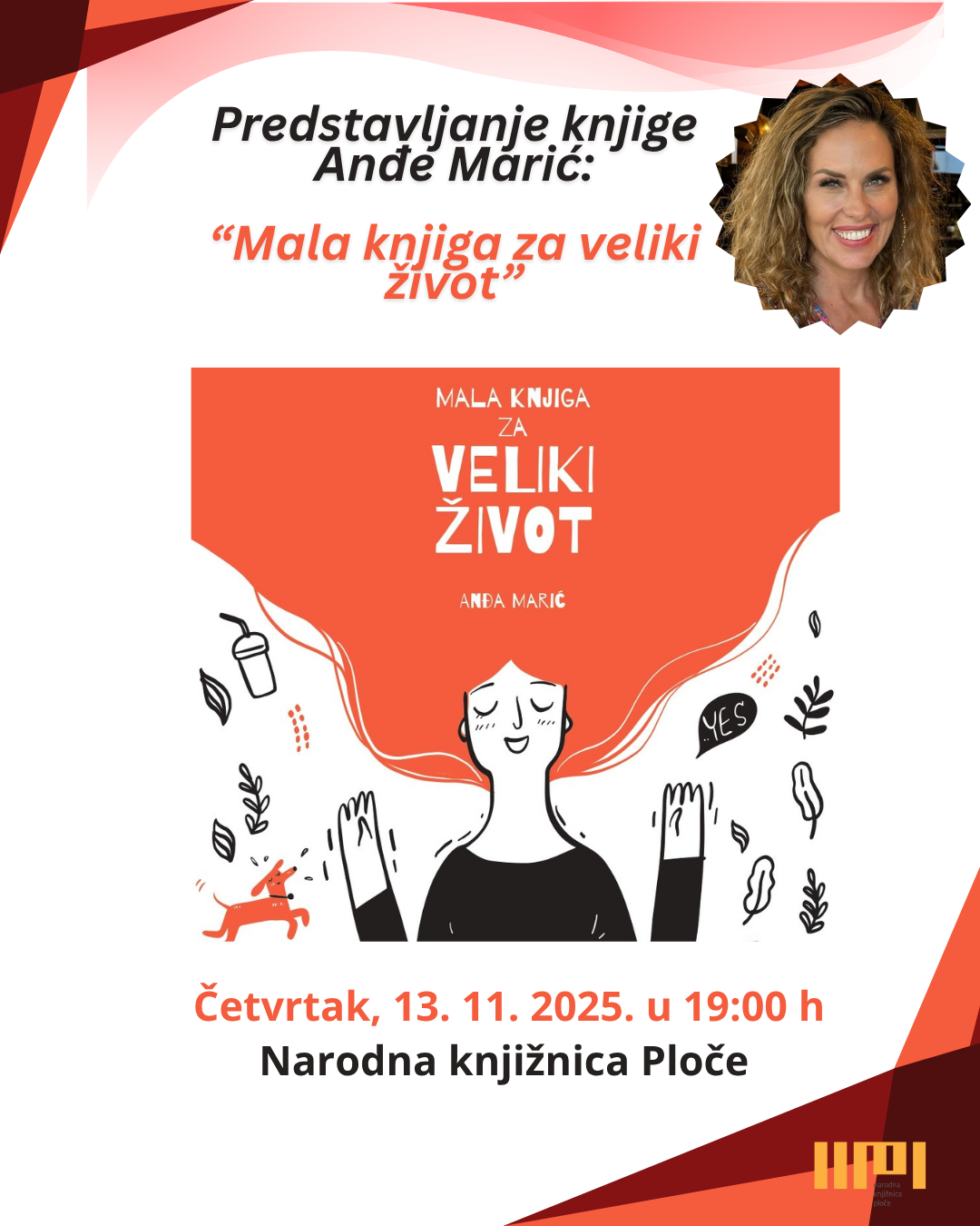 U sklopu Mjeseca hrvatske knjige, u Narodnoj knjižnici Ploče u četvrtak, 13. studenoga u 19 sati, održat će se gostovanje Anđe Marić, glazbenice, autorice i motivatorice.