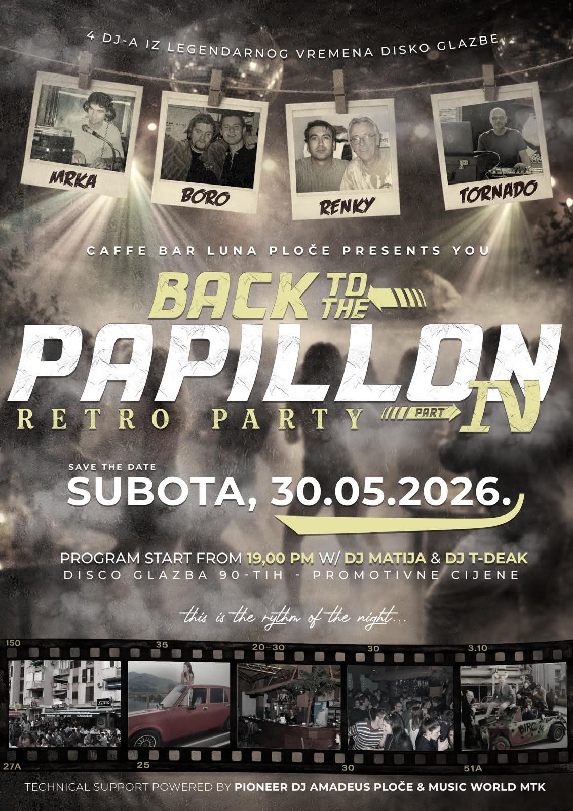 Ploče se krajem svibnja ponovno vraćaju u ritam devedesetih. U Caffe baru Luna najavljen je četvrti nastavak popularnog retro događaja Back to Papillon, koji će se održati u subotu, 30. svibnja 2026., s početkom u 19 sati.