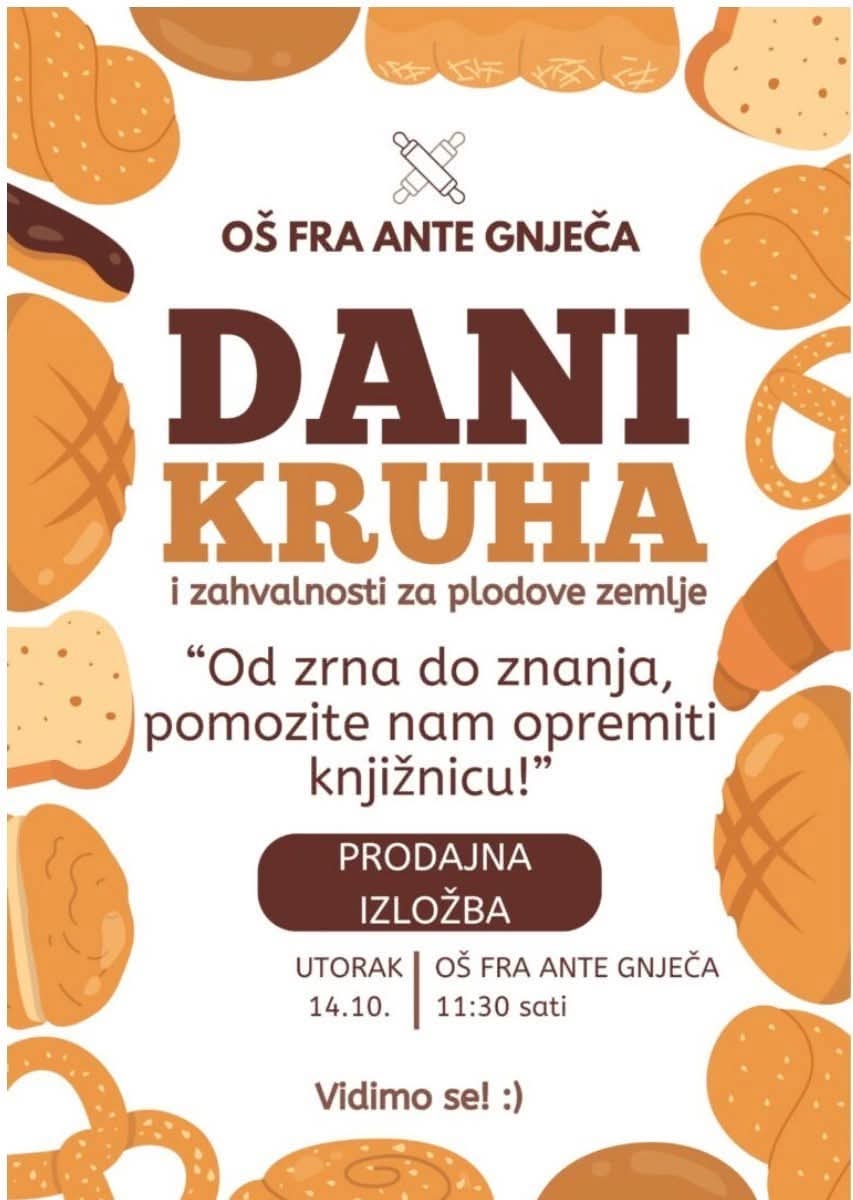 Osnovna škola fra Ante Gnječa u Staševici obilježit će Dane kruha i zahvalnosti za plodove zemlje organizacijom prodajne izložbe pod geslom „Od zrna do znanja, pomozite nam opremiti knjižnicu.“
