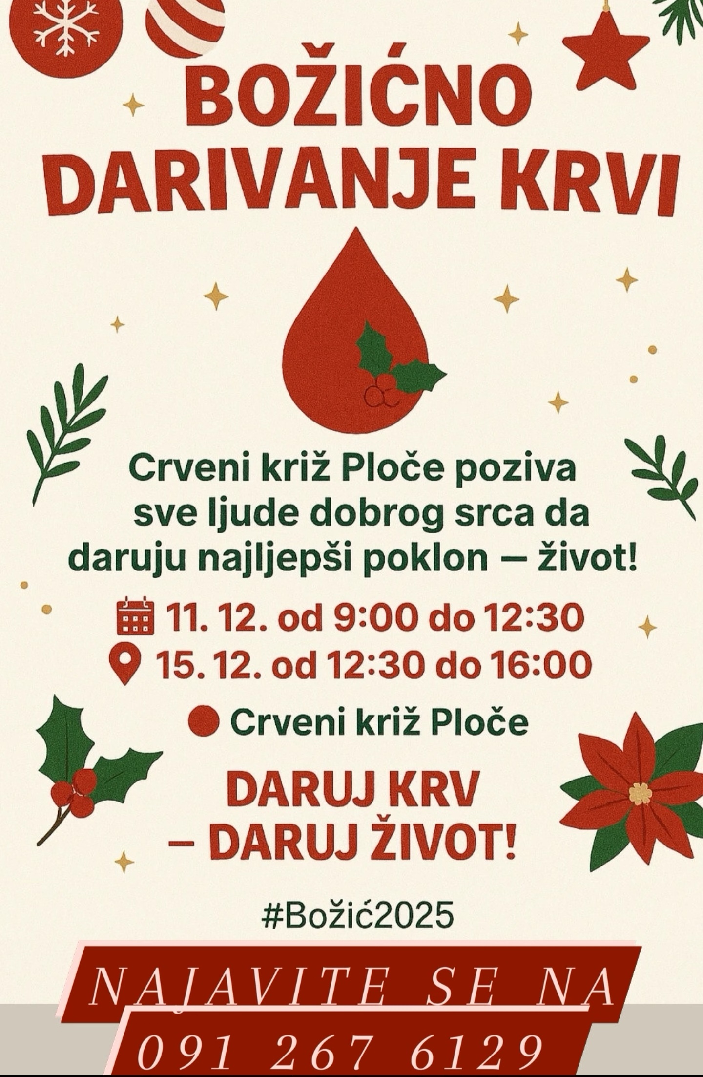 Gradsko društvo Crvenog križa Ploče najavilo je dvije akcije dobrovoljnog darivanja krvi koje će se održati tijekom prosinca. Prva akcija zakazana je za 11. prosinca od 9:00 do 12:30 sati, a druga 15. prosinca u vremenu od 12:30 do 16:00 sati. Darivanje će se provoditi u prostoru Gradskog društva Crvenog križa Ploče na adresi Vladimira Nazora 20.