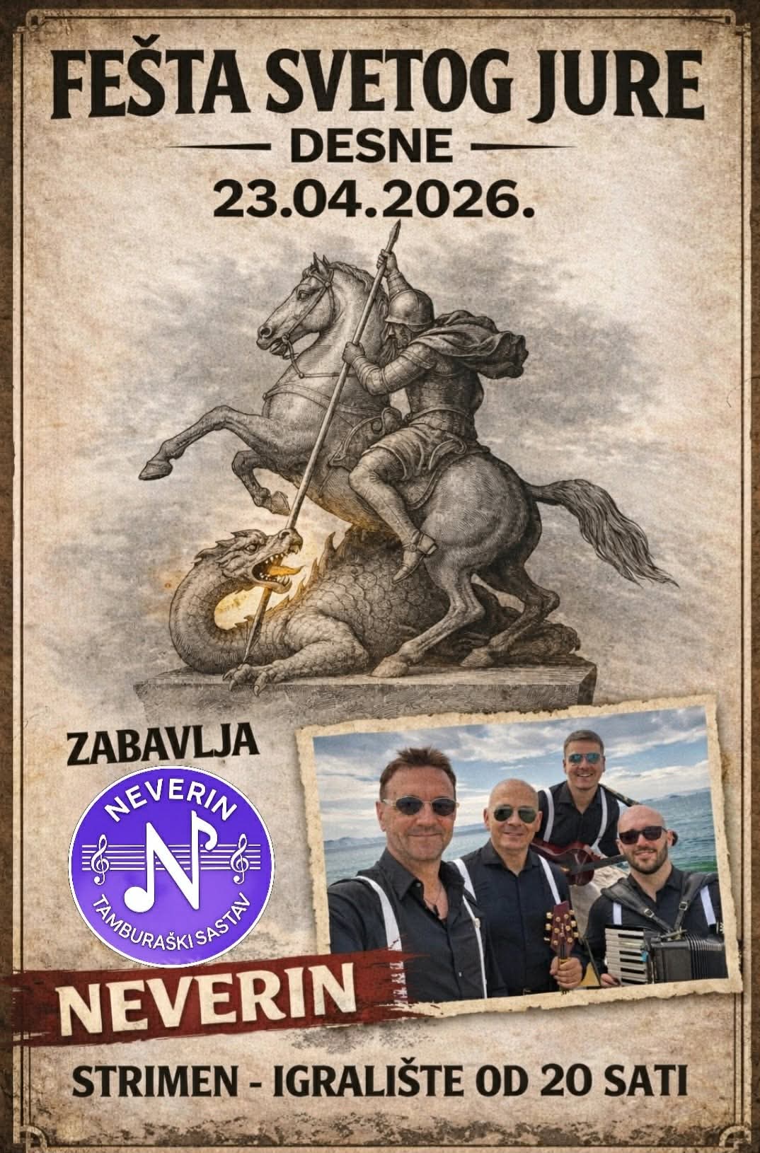Udruga mladih Desne poziva sve mještane i posjetitelje na proslavu blagdana svetog Jure, zaštitnika mjesta, koja će se održati u četvrtak, 23. travnja 2026. godine.