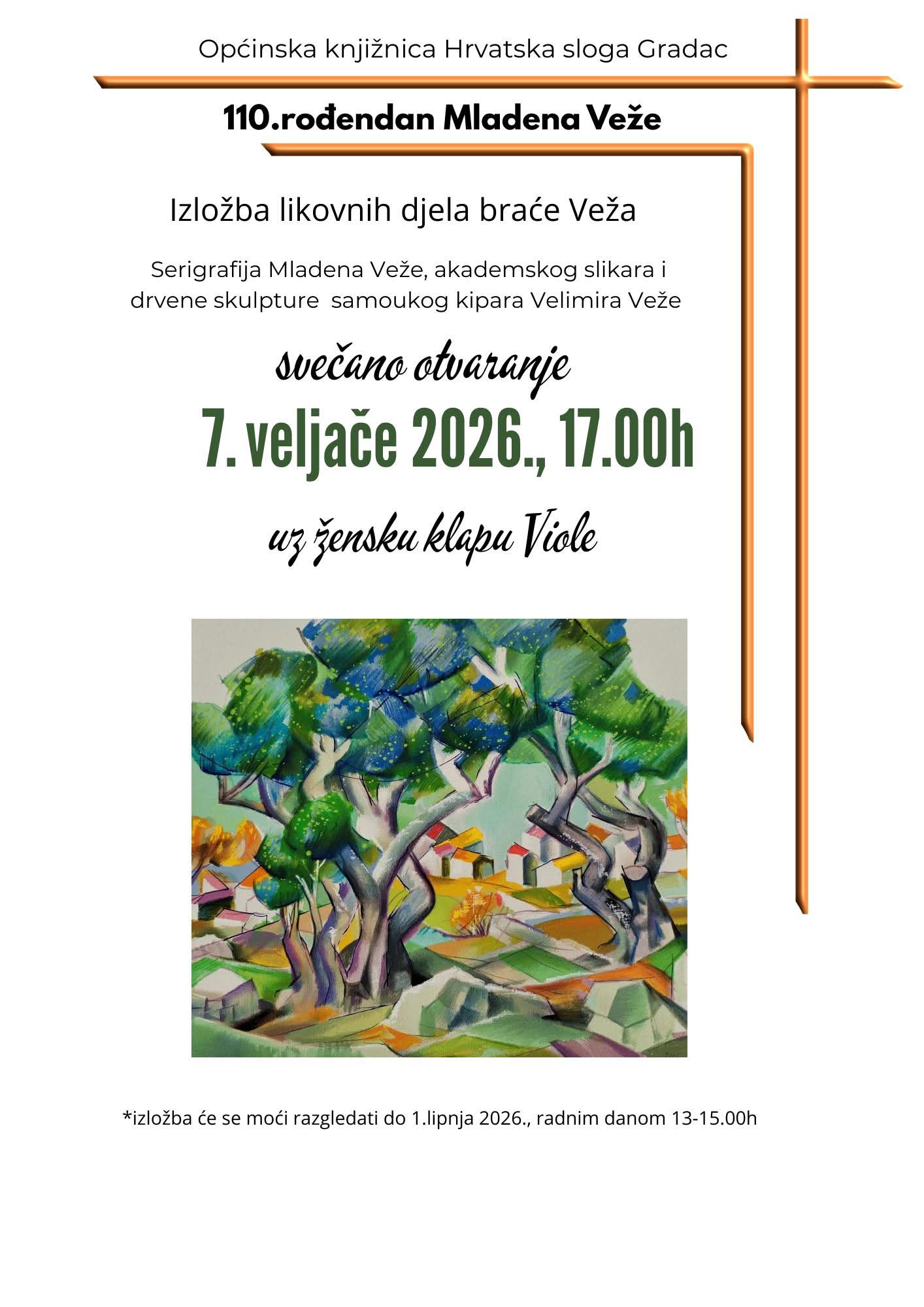 Općinska knjižnica „Hrvatska sloga“ Gradac organizira svečano otvaranje izložbe likovnih djela braće Veža, kojom će se obilježiti 110. rođendan akademskog slikara Mladena Veže te odati počast i sjećanje na samoukog kipara Velimira Vežu.