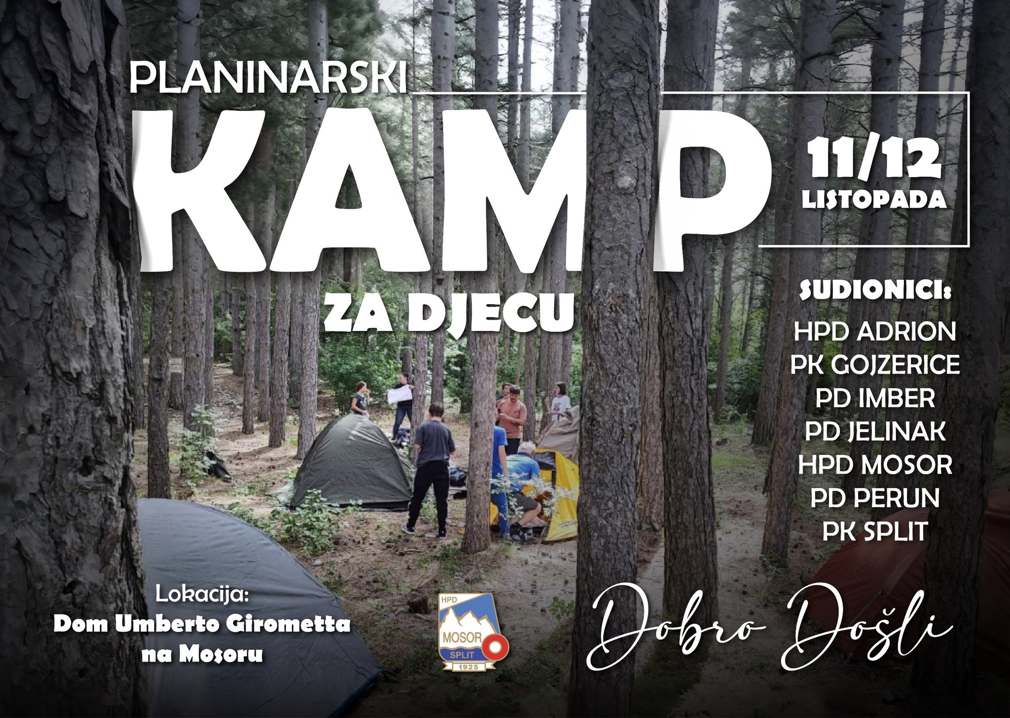 Hrvatsko planinarsko društvo „Mosor“ organizira Planinarski kamp za djecu koji će se održati 11. i 12. listopada kod doma Umberto Girometta na Mosoru. Događaj je namijenjen djeci članovima planinarskih društava i osmišljen kako bi kroz igru i druženje učili o prirodi, planini i planinarenju.