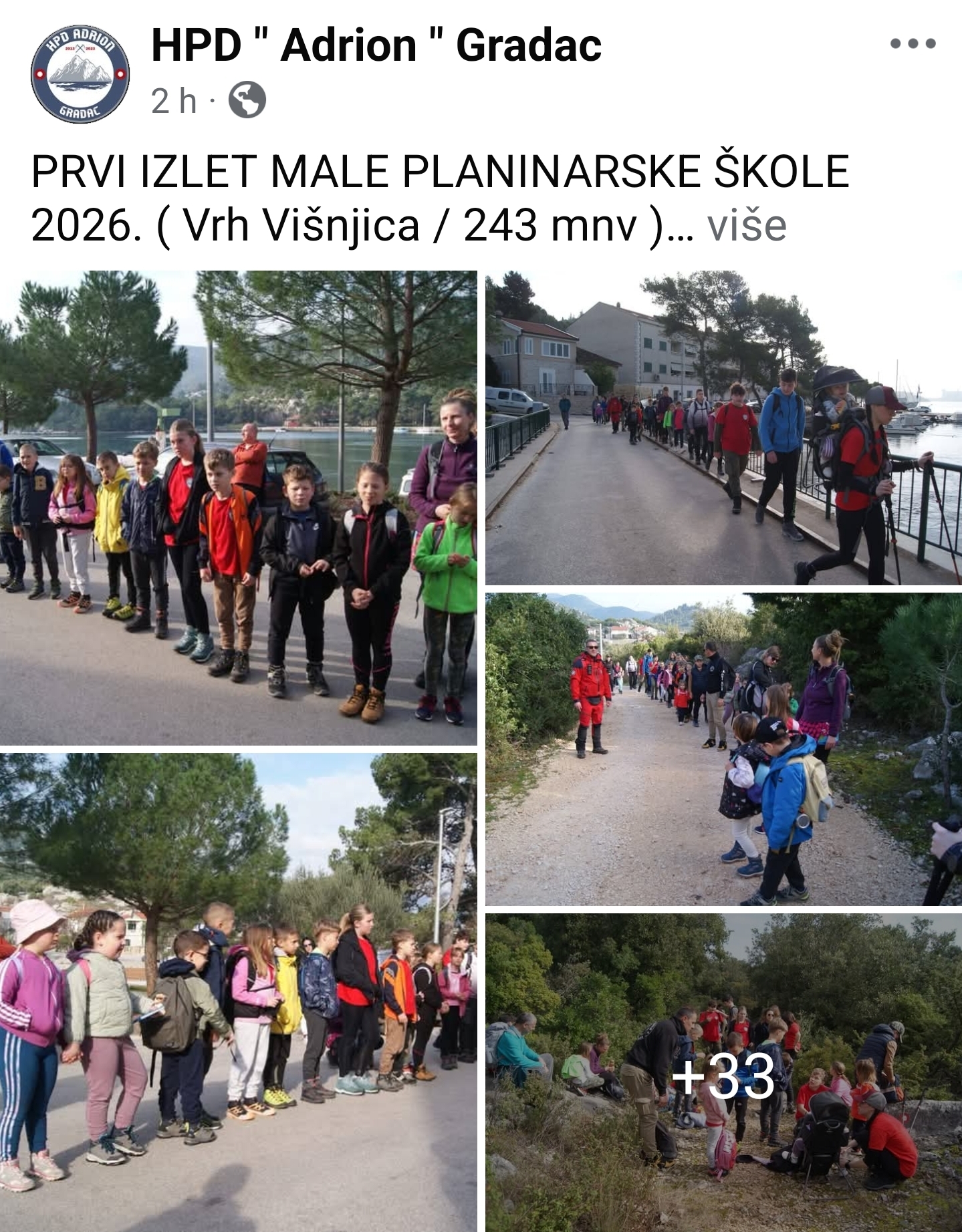 Druga generacija Male planinarske škole u organizaciji HPD Adrion iz Gradac započela je svoju avanturu prvim izletom na vrh Višnjica (243 mnv). U nedjelju, 1. ožujka 2026., čak 29 djece u pratnji roditelja i vodstva okupilo se u Portini, naselju u sklopu Baćina, kako bi zajedno zakoračili u novu planinarsku godinu ispunjenu učenjem, druženjem i boravkom u prirodi.