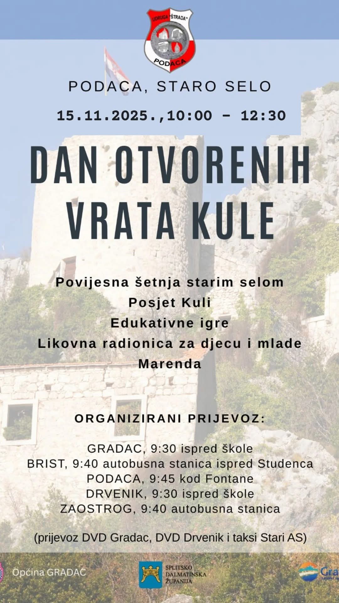Udruga Štrada iz Podace najavila je održavanje Dana otvorenih vrata Kule u starom selu u subotu, 15. studenoga 2025., od 10 do 12:30 sati. Nakon što su obnovljene oštećene stepenice na ulazu u Kulu te popravljene unutarnje stepenice koje vode na vrh, povijesna kula iz 16. stoljeća ponovno će biti otvorena za posjetitelje. Time će ovaj vrijedan spomenik lokalne baštine ponovno biti siguran i dostupan svima koji žele razgledati njezinu unutrašnjost i uživati u pogledu na pelješki kanal.
