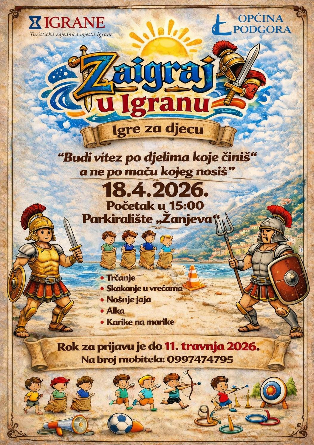 Pozivamo svu djecu da sudjeluju u zabavnom događaju „Zaigraj u Igranu“, danu ispunjenom igrama, smijehom i sportskim izazovima. Događaj će se održati 18. travnja 2026. s početkom u 15:00 sati na parkiralištu „Žanjeva“. Djeca će sudjelovati u raznim igrama kao što su trčanje, skakanje u vrećama, nošenje jaja, alka i karike na marike. Moto događaja je: „Budi vitez po djelima koja činiš, a ne po maču kojeg nosiš.“