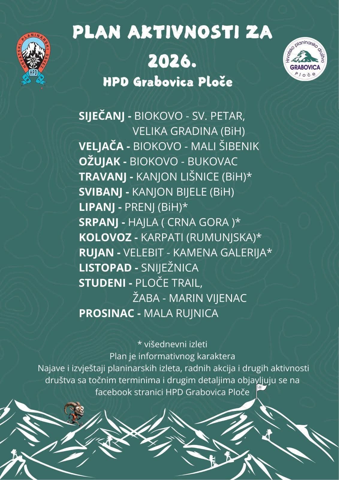 HPD Grabovica Ploče objavilo je plan aktivnosti i izleta za 2026. godinu te započelo s upisima i obnovom članstva za novu planinarsku sezonu.