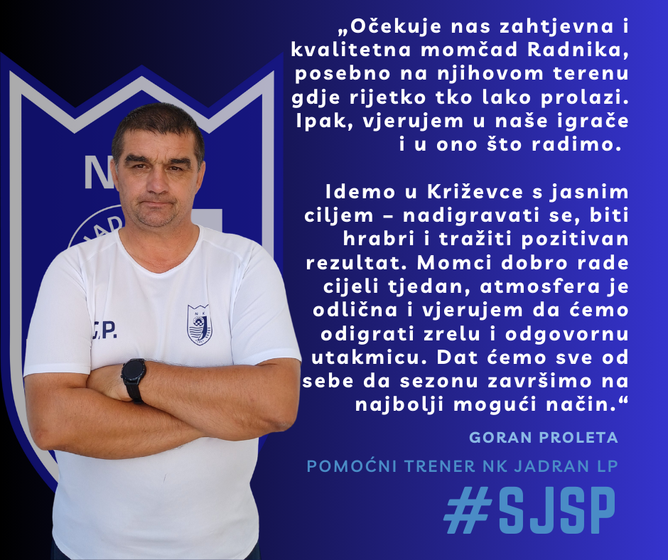 NK Jadran LP u subotu igra posljednju utakmicu jesenskog dijela 2. NL, i to u gostima kod Radnika iz Križevaca, a pomoćni trener Goran Proleta vjeruje da momčad može ostvariti dobar rezultat. Proleta je istaknuo kako ih očekuje zahtjevna i kvalitetna domaća ekipa, posebno na svom terenu, gdje rijetko tko lako dolazi do bodova, ali naglašava da Jadran ima jasnu ideju i dovoljno kvalitete za ravnopravno nadigravanje.