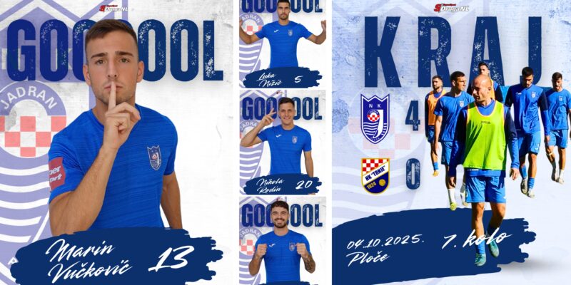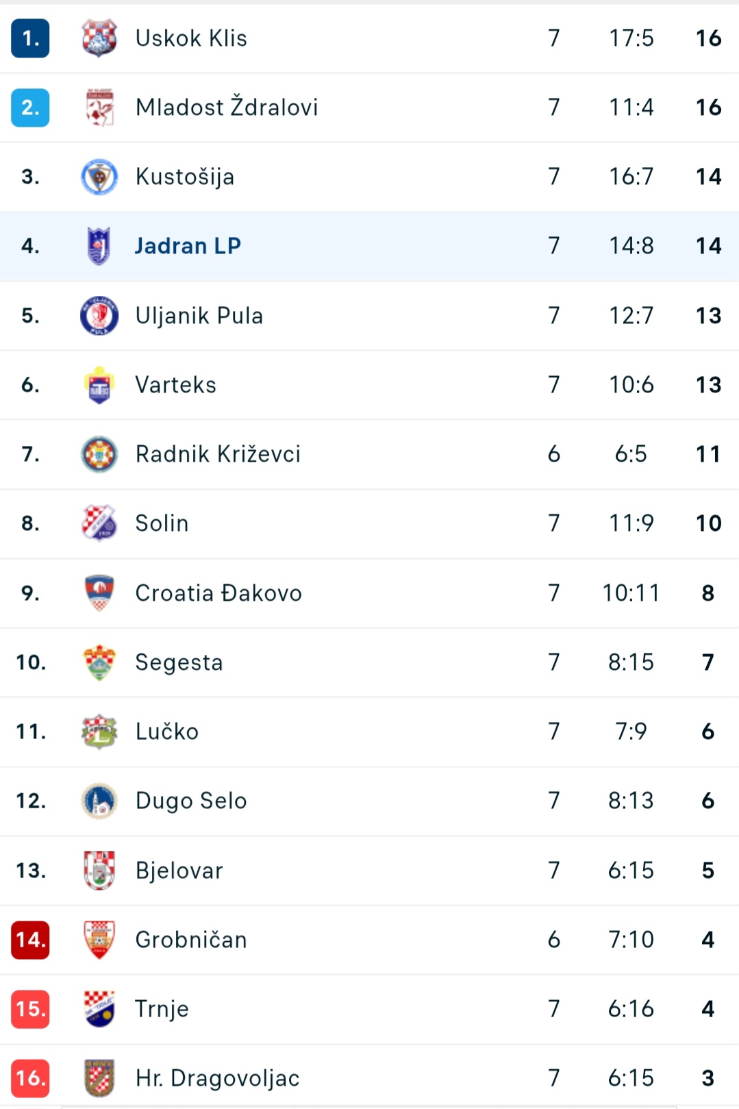 Jadran je nakon sedam kola treći na ljestvici s odličnim učinkom u gostima (7 od 9 bodova) i sve sigurnijom igrom pred domaćom publikom. Sljedeće kolo (11. listopada) „plavi“ gostuju kod Uljanika u Puli, a potom u Ploče stiže lider Mladost Ždralovi.