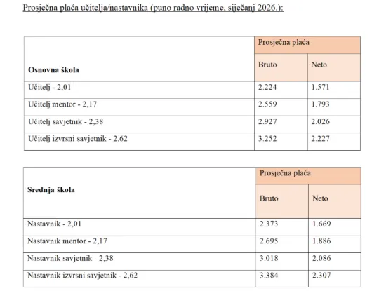 Iz Ministarstva su objavili i iznose prosječne plaće učitelja i profesora za siječanj 2026. godine, koje u objavljujemo nastavku.