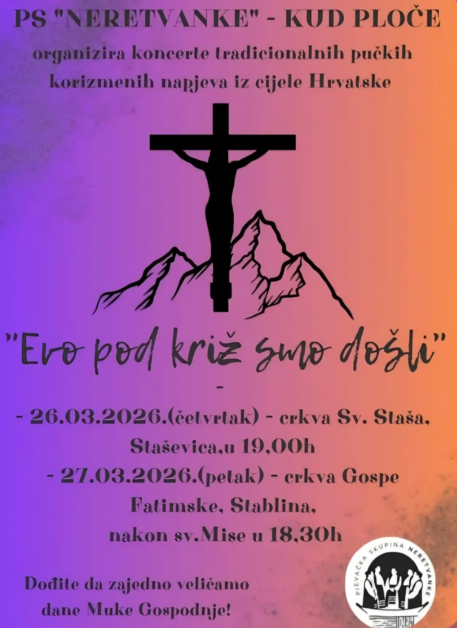 Pjevačka skupina „Neretvanke“ – KUD Ploče organizira koncerte tradicionalnih pučkih korizmenih napjeva iz cijele Hrvatske pod nazivom „Evo pod križ smo došli“.