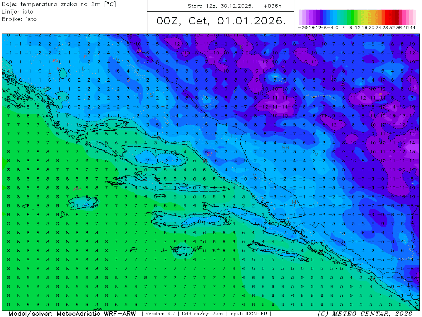 U novogodišnjoj noći bit će vedro, većinom uz slabu buru, a na moru može biti slabog jugozapadnjaka. Bit će hladno. Tako će sredinom noći temperature u Dalmatinskoj zagori biti od -7 do -2°C, uz obalu i na otocima od -2 do 4°C.