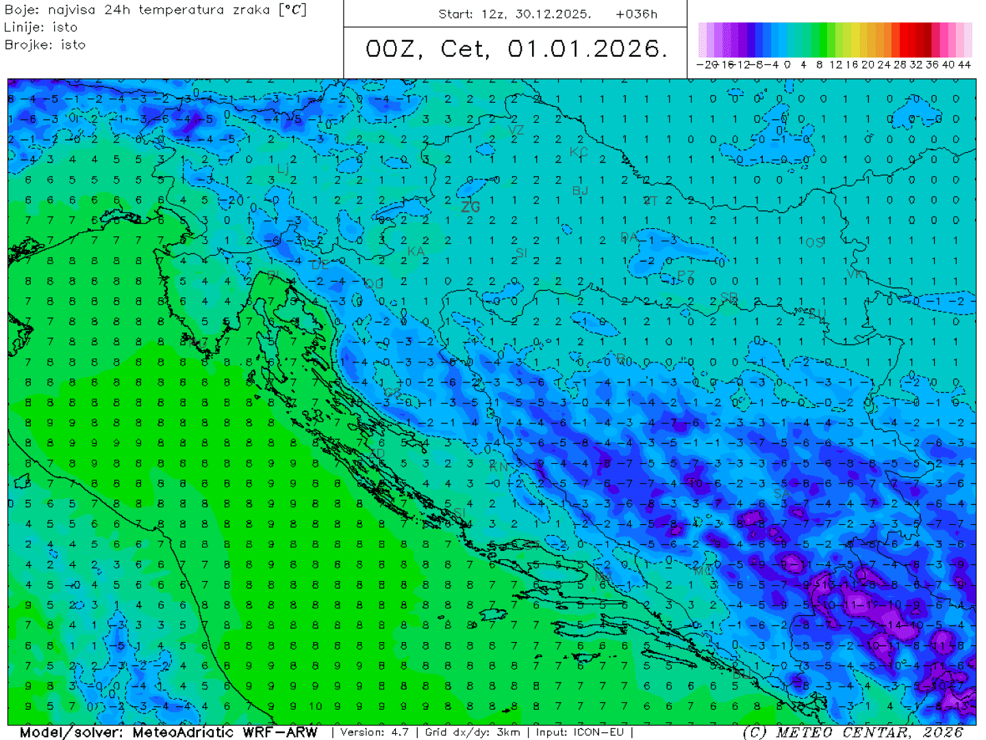 Očekivane najviše dnevne temperature zraka na Staru godinu