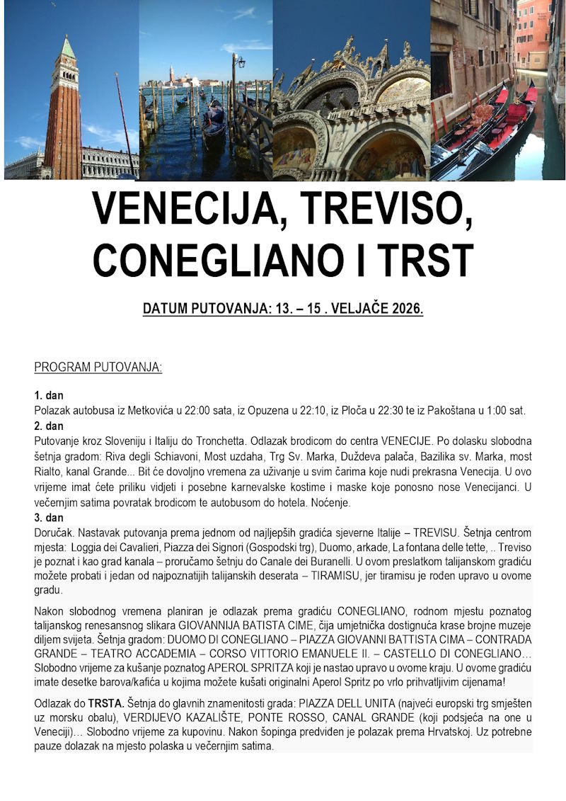 Doživite karneval na Piazzi San Marco, slobodnu šetnju Venecijom, njezine kanale, mostove i trgove, uz posebnu čar maski i kostima koji ovom gradu daju magičnu dimenziju.