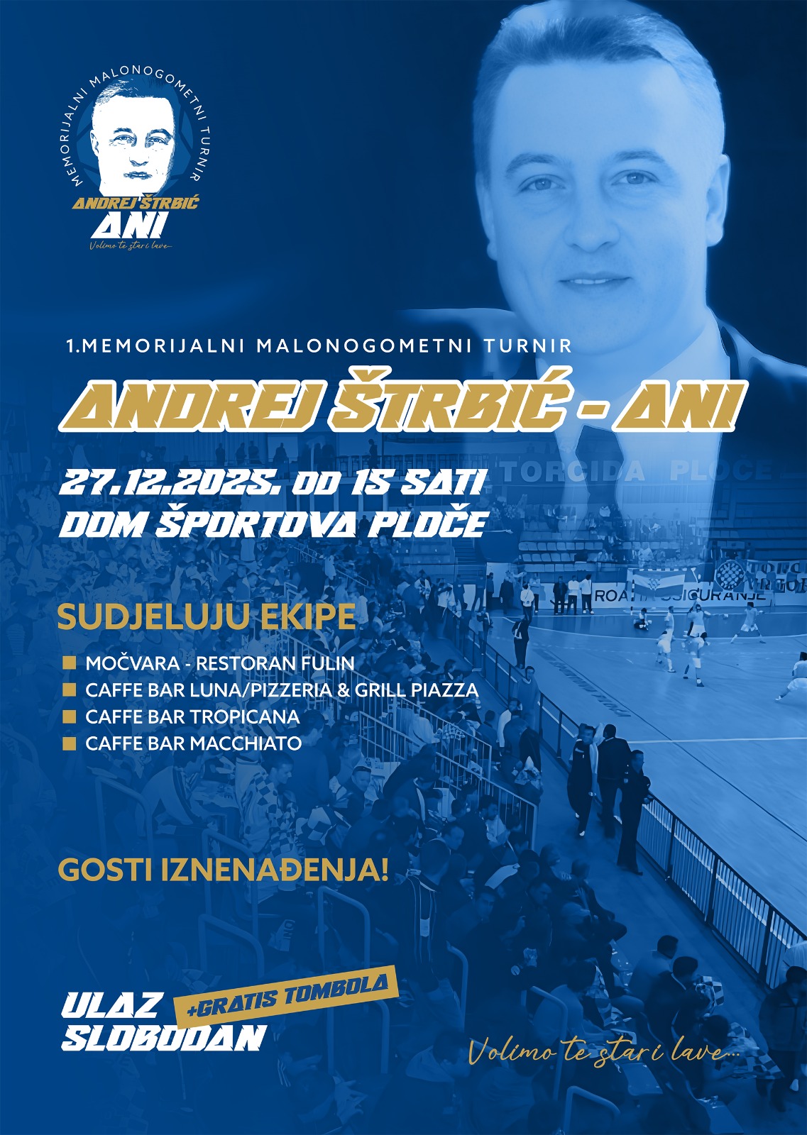 U Domu športova Ploče održat će se prvo izdanje Memorijalnog malonogometnog turnira “Andrej Štrbić – Ani” u spomen na prerano preminulog sugrađanina. Turnir, koji za cilj ima očuvanje sjećanja na Anija, okupit će četiri lokalne ekipe koje će se boriti za naslov pobjednika te osvojiti prijelazni pehar.