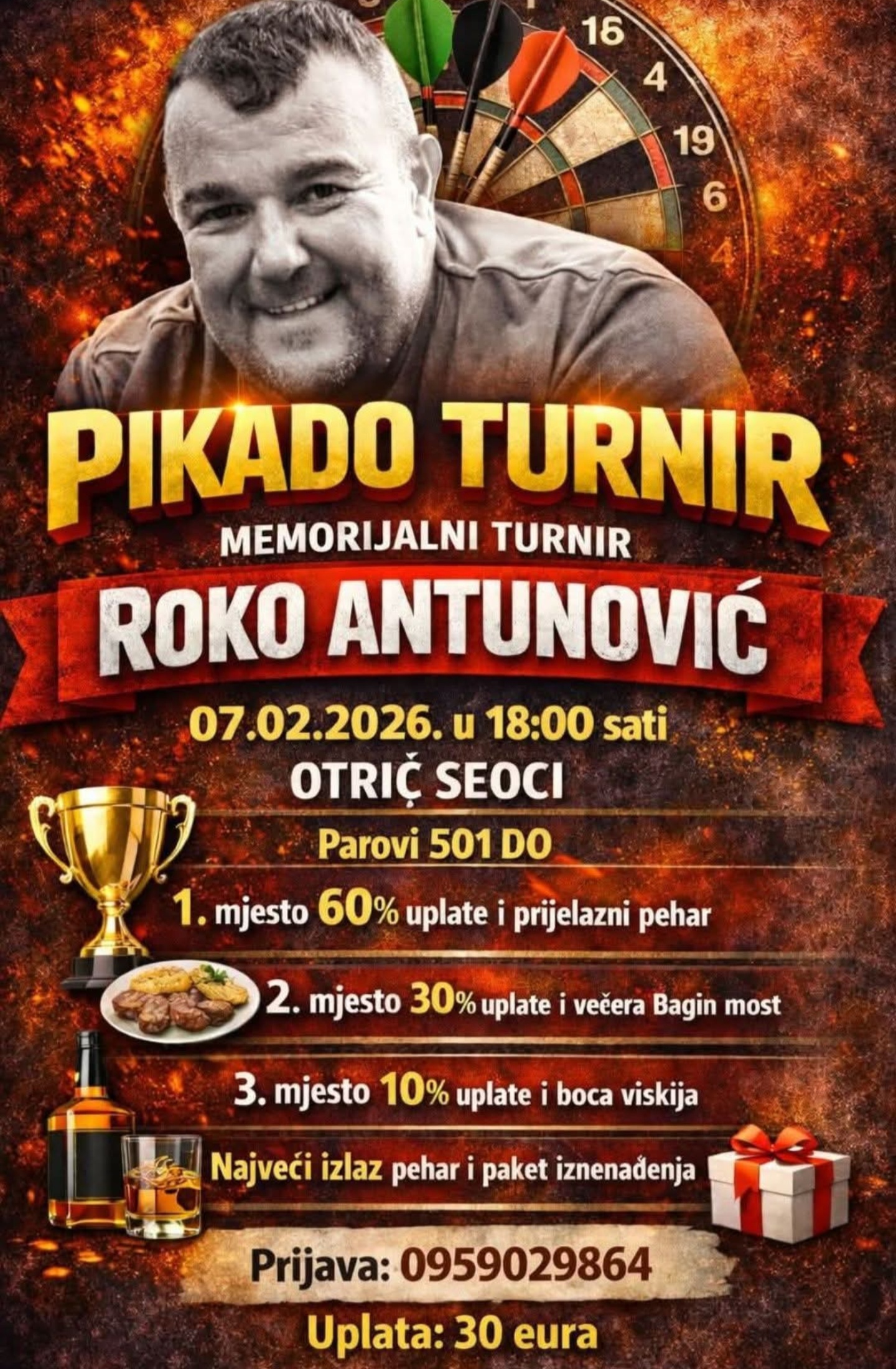 U Otrić Seocima 7. veljače 2026. s početkom u 18 sati održat će se memorijalni pikado turnir u čast pokojnog Roka Antunovića. Natjecanje se igra u paru, sustav 501 DO.