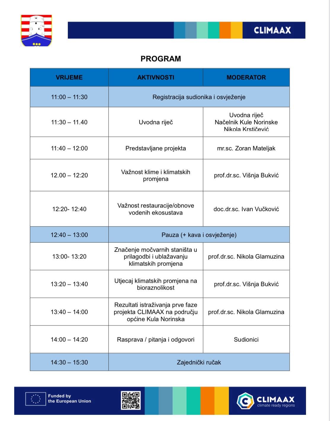 Program događanja započinje registracijom sudionika u 11 sati, a nastavlja se nizom stručnih izlaganja i raspravom na temu važnosti klime, obnova vodenih ekosustava te prilagodbi na klimatske promjene. Predviđeno je i predstavljanje rezultata prve faze istraživanja projekta CLIMAAX na području općine Kula Norinska.