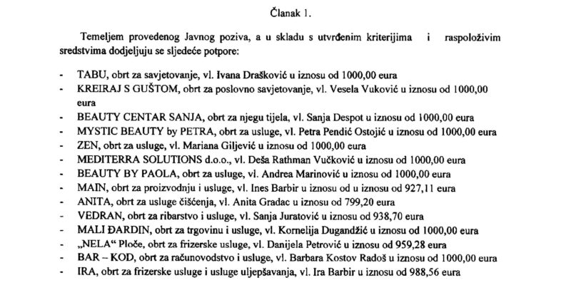 - KREIRAJ S GUŠTOM, obrt za poslovno savjetovanje, vl. Vesela Vuković u iznosu od 1000,00 eura