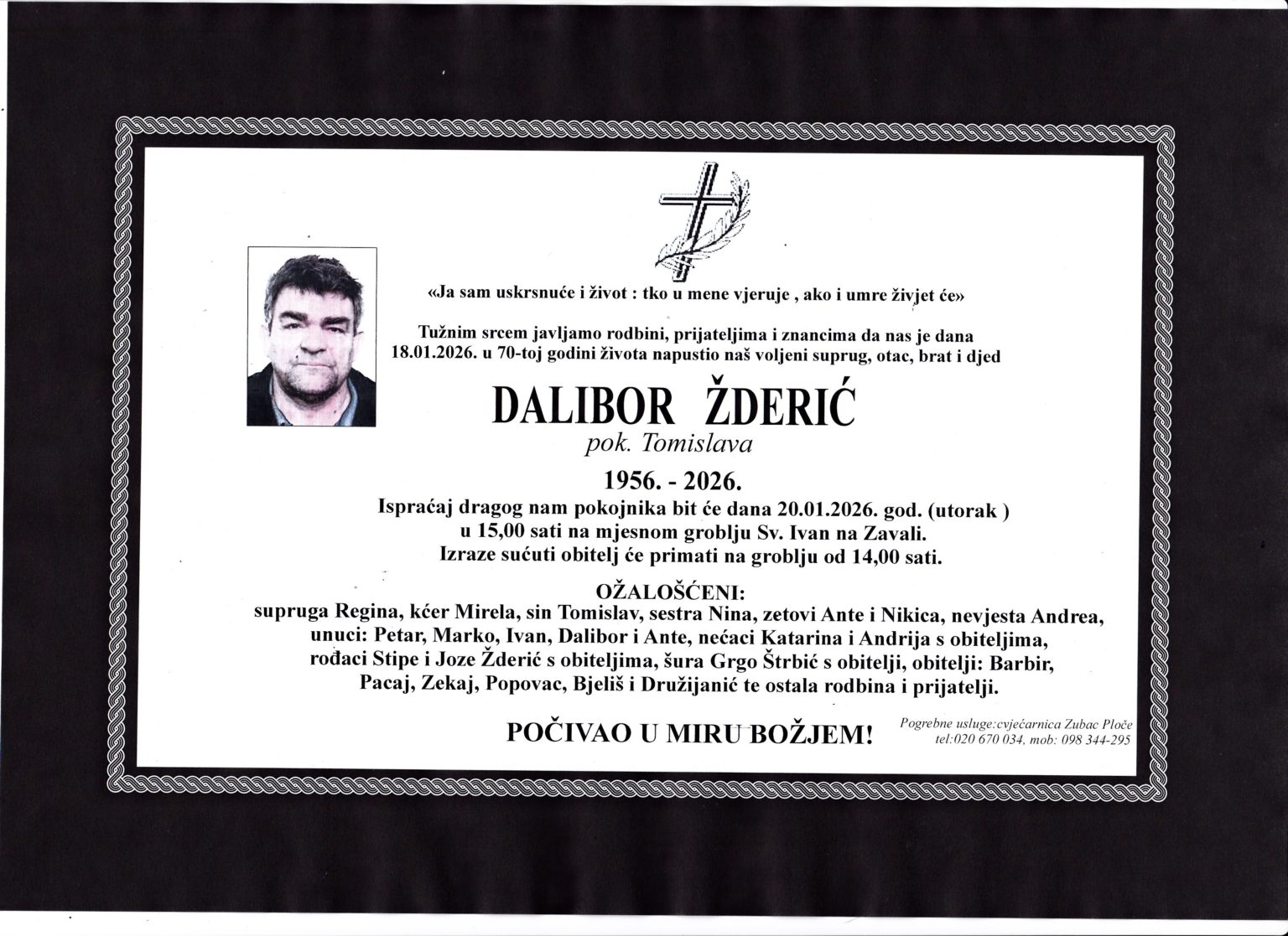 Dalibor Žderić preminuo je 18. siječnja 2026. godine, u 70. godini života. Posljednji ispraćaj bit će u utorak, 20. siječnja 2026. godine, u 15 sati na mjesnom groblju sv. Ivana na Zavali, dok će se izrazi sućuti obitelji primati na groblju od 14 sati.