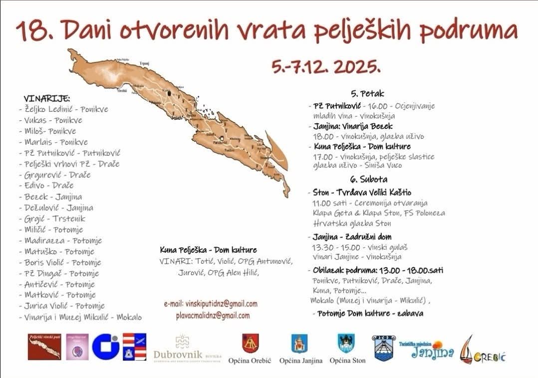Pelješki vinari i ove godine otvaraju vrata svojih podruma u sklopu manifestacije 18. Dani otvorenih vrata peljeških podruma, koja će se održati od 5. do 7. prosinca 2025. Riječ je o jednoj od najprepoznatljivijih eno-gastro manifestacija juga Hrvatske, tijekom koje posjetitelji imaju priliku obići pelješke vinare, kušati mlada vina te upoznati bogatu tradiciju vinogradarstva i vinarstva ovog područja.