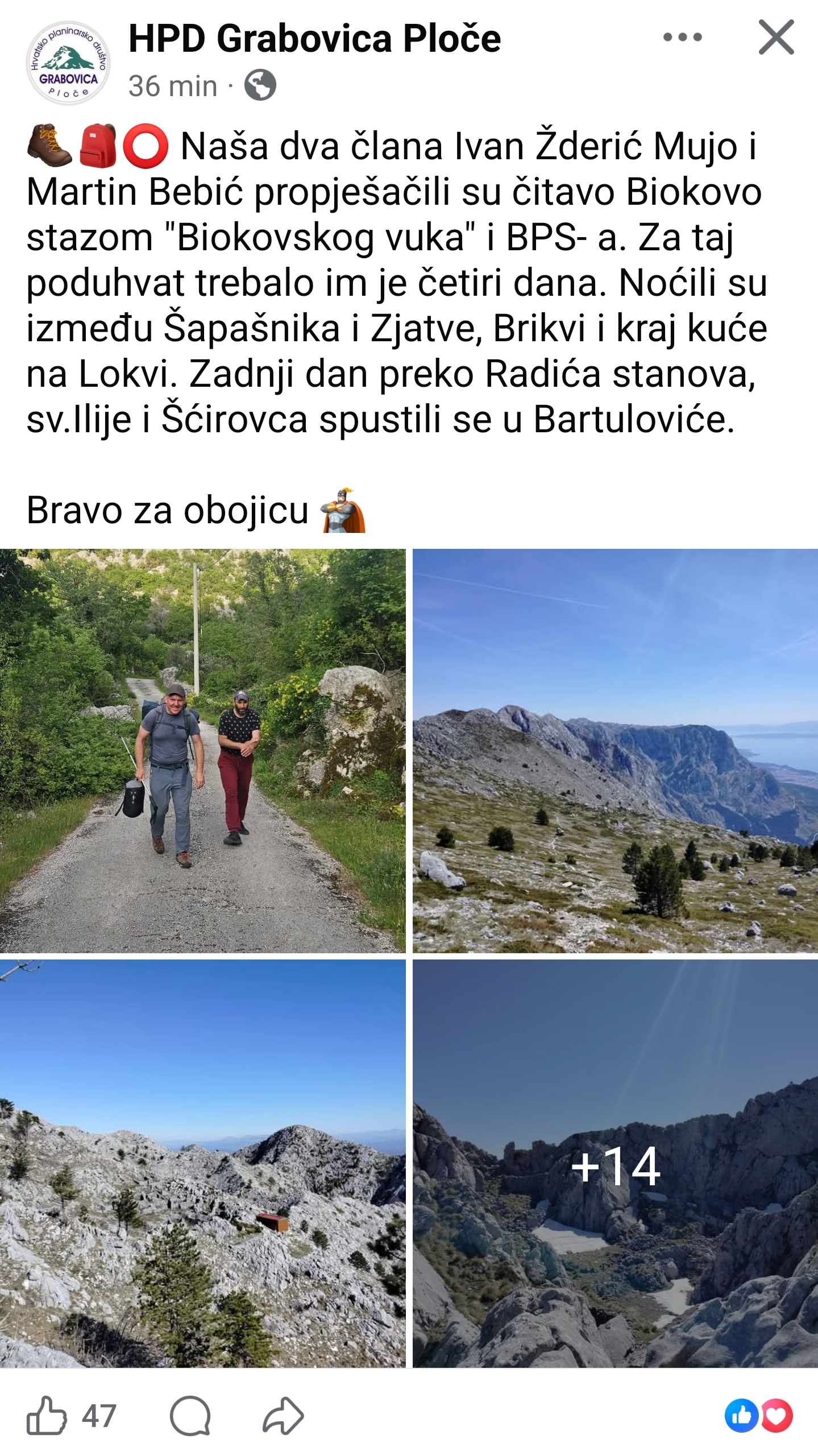 Dvojica članova Hrvatskog planinarskog društva Grabovica iz Ploča, Ivan Žderić Mujo i Martin Bebić, uspješno su propješačili čitav masiv Biokovo prateći zahtjevnu stazu poznatu kao “Biokovski vuk” i BPS-a. Ovaj zahtjevan pothvat realizirali su u četiri dana hoda kroz jedno od najizazovnijih planinskih područja u Dalmaciji.
