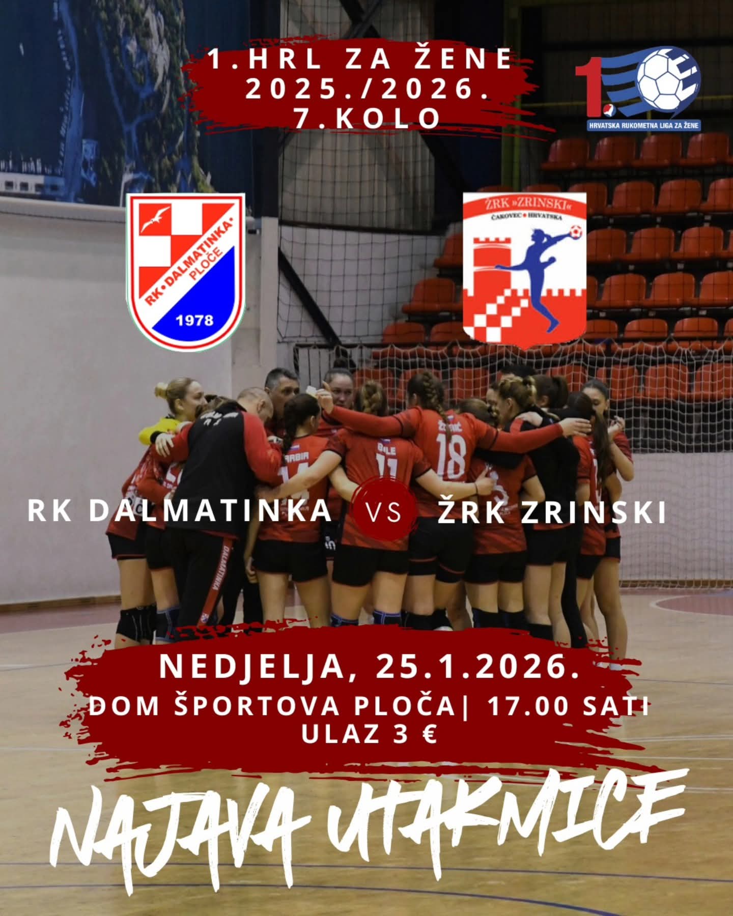 U sklopu 12. kola 1. hrvatske rukometne lige za žene, rukometašice Dalmatinka u nedjelju pred domaćom publikom dočekuju Zrinski, u susretu koji nosi poseban rezultatski i psihološki značaj za pločansku ekipu.