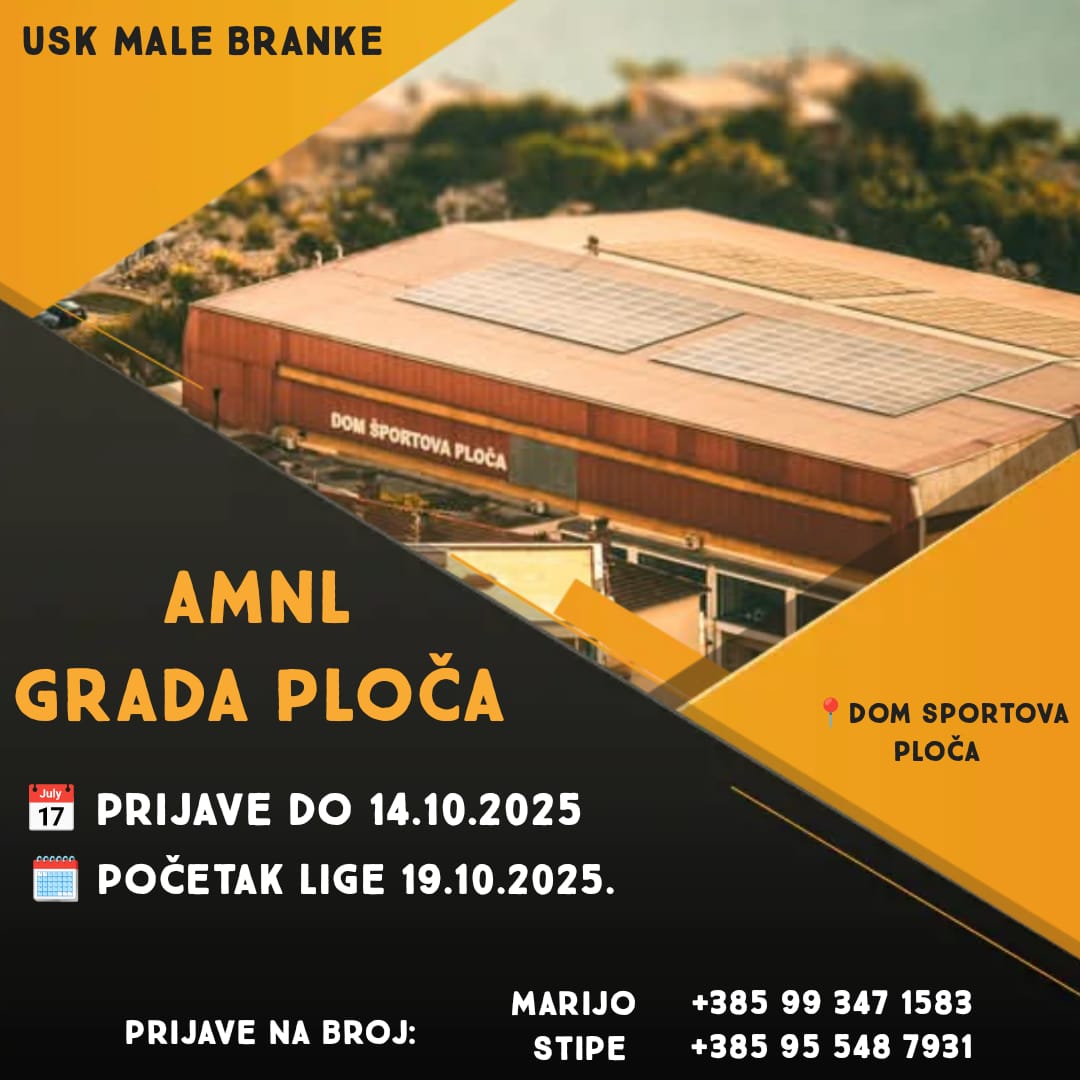 U Domu sportova Ploča uskoro kreće novo izdanje Amaterske malonogometne lige (AMNL) Grada Ploča. Organizator USK Male Branke poziva sve zainteresirane ekipe da se prijave najkasnije do 14. listopada 2025. godine.