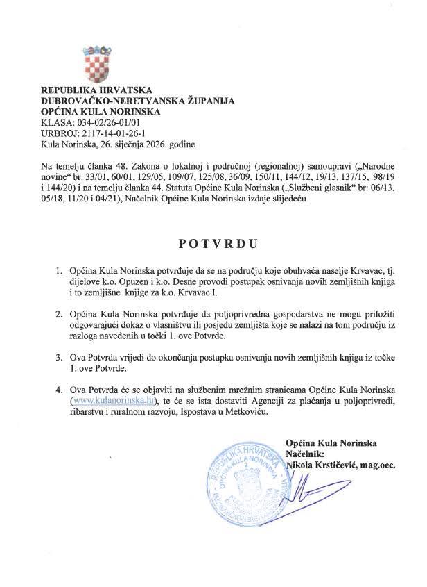 Također, nisu obvezna dostavljati ovjerene izjave, druge popratne dokumente niti potvrdu Općine Kula Norinska. Ova odluka ima za cilj olakšati postupak poljoprivrednim gospodarstvima na navedenom području tijekom provedbe osnivanja nove zemljišne knjige.