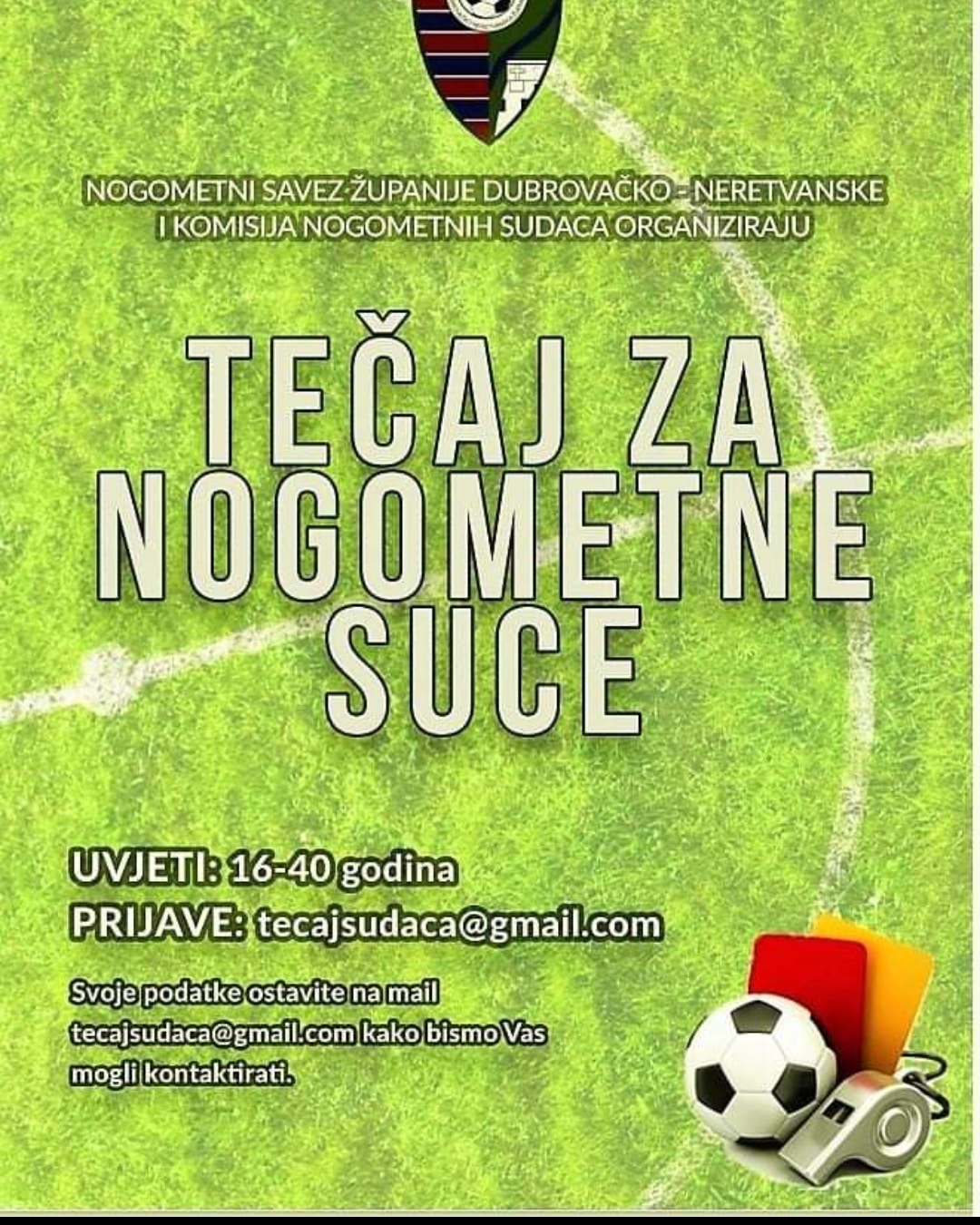 Nogometni savez Dubrovačko-neretvanske županije, u suradnji s Komisijom nogometnih sudaca, organizira tečaj za nove nogometne suce.
