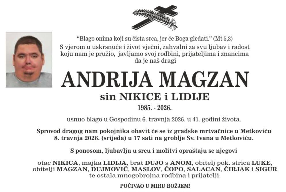 Posljednji ispraćaj bit će u srijedu, 8. travnja 2026. godine u 17 sati na groblju sv. Ivana u Metkoviću.