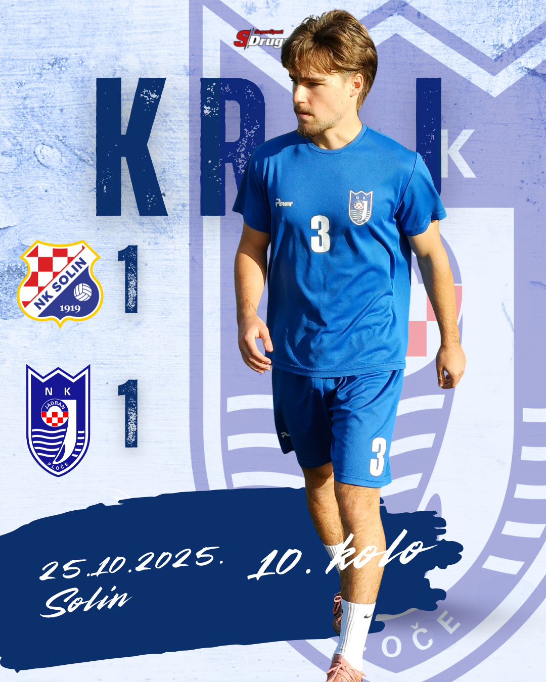 Dalmatinski derbi između Solina i Jadrana Luka Ploče, odigran u sklopu 10. kola SuperSport Druge NL, završio je bez pobjednika – 1:1. Svaka momčad po jedan pogodak, svaka po bod, i dojam da su Pločani mogli i više.