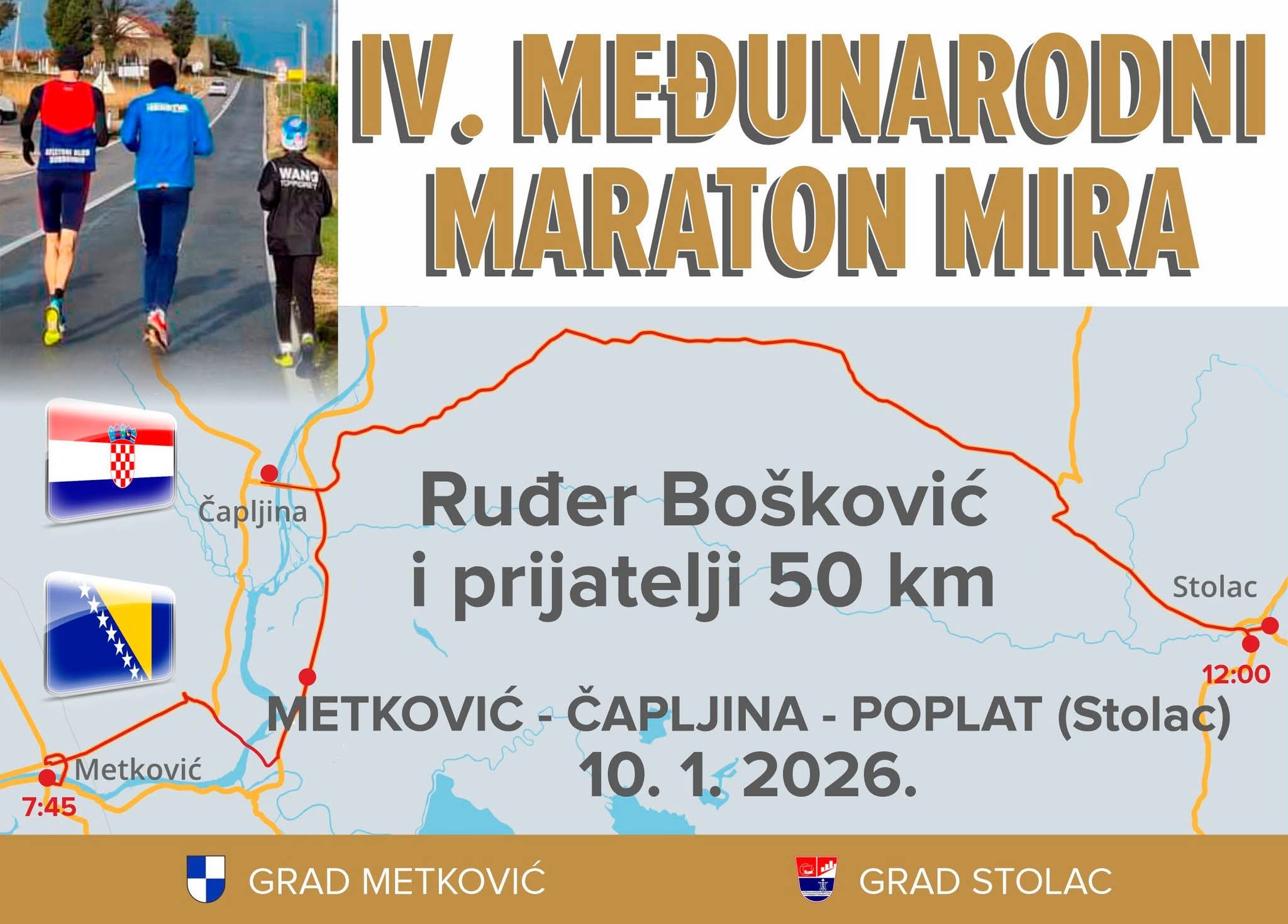 U subotu, 10. siječnja 2026. godine, s početkom u 07:45 sati, ispred Spomenika hrvatskim braniteljima u Gradskom parku Metković, započet će četvrti po redu Memorijalni Maraton Mira, međunarodni događaj koji povezuje dvije države – Hrvatsku i Bosnu i Hercegovinu – te tri grada: Metković, Čapljinu i Stolac.