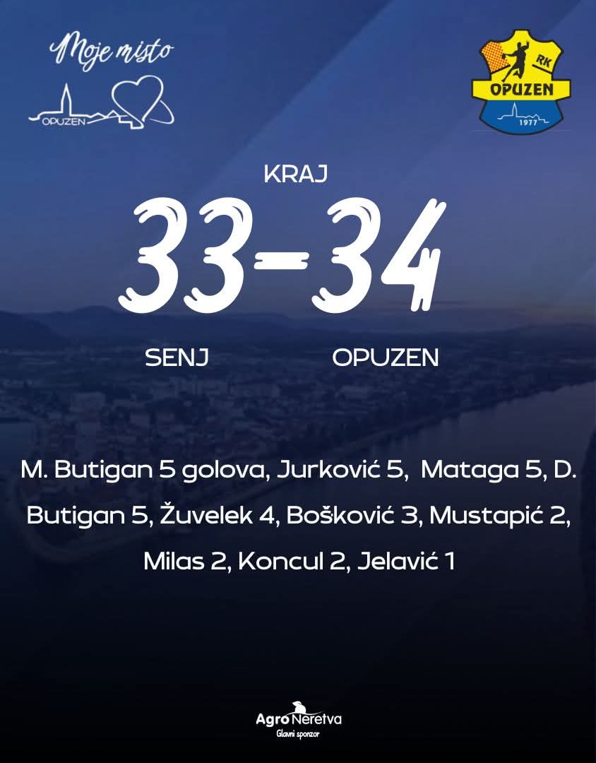 U uzbudljivoj utakmici 2. HRL Jug, rukometaši Opuzena ostvarili su veliku gostujuću pobjedu protiv Senja rezultatom 34:33 (16:19). Iako su gotovo cijeli susret bili u zaostatku, Opuzenci su u završnici pokazali nevjerojatnu borbenost i karakter te pogotkom u posljednjim sekundama stigli do zasluženog slavlja.
