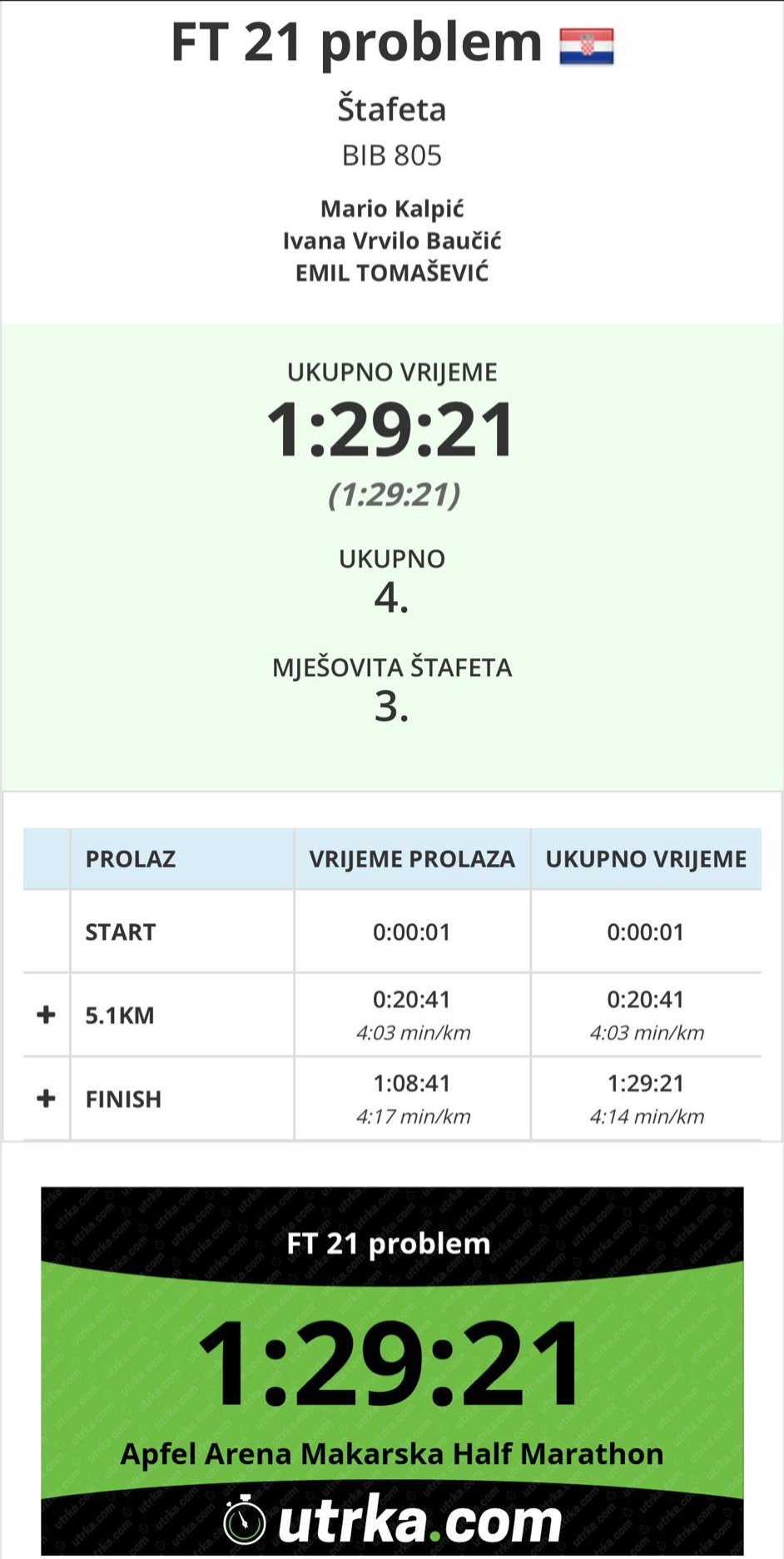 Na ovogodišnjem Apfel Arena Makarska Half Marathonu, u sklopu štafetnog dijela natjecanja, nastupila je i ekipa FT 21 problem, u sastavu Emil Tomašević, Mario Kalpić i Ivana Vrvilo Baučić.