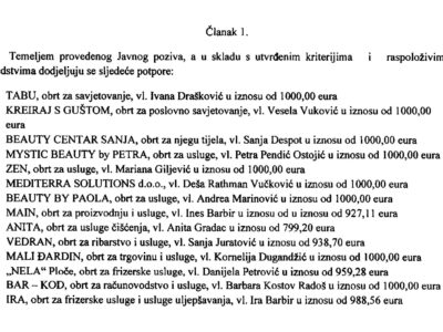 Odluka o odabiru i dodjeli sredstava potpora male vrijednosti ženama poduzetnicama na području Grada Ploča