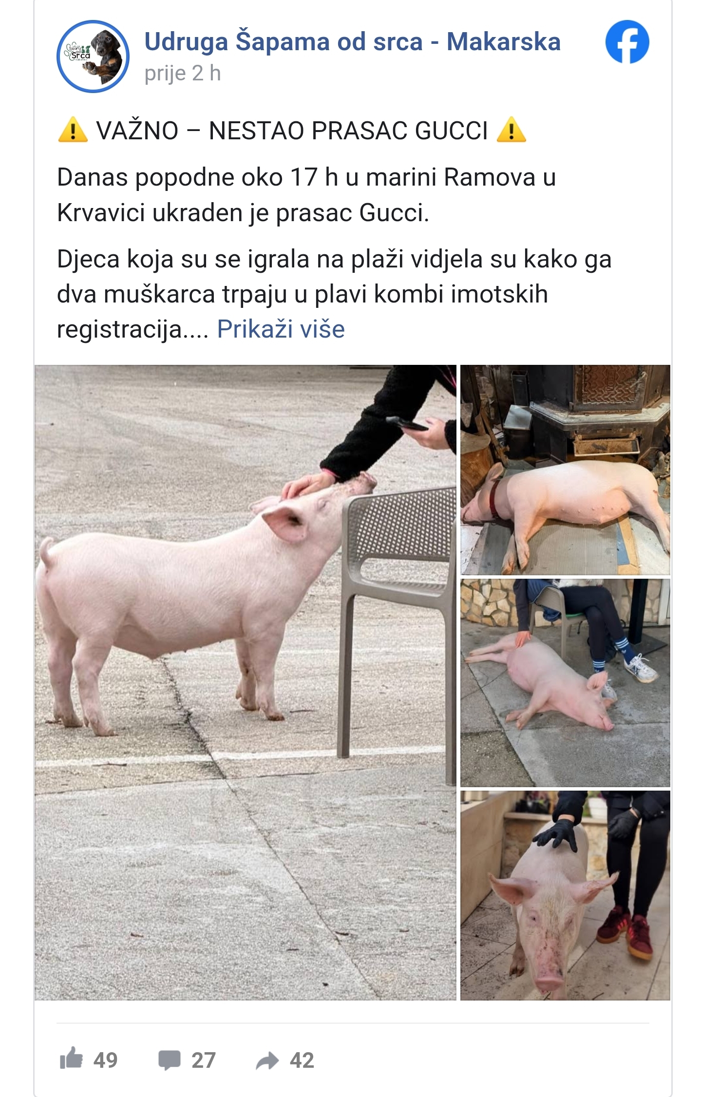 “Danas popodne u marini Ramova u Krvavici ukraden je prasac Gucci. Djeca koja su se igrala na plaži vidjela su kako ga dva muškarca trpaju u plavi kombi imotskih registracija. Molimo sve koji imaju bilo kakvu informaciju da se jave. Pomozite da se Gucci vrati kući!”, stoji u objavi.