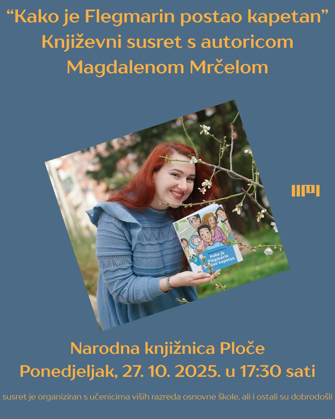 U ponedjeljak, 27. listopada, s početkom u 17:30 sati, održat će se književni susret s autoricom Magdalenom Mrčelom i predstavljanje njezina romana „Kako je Flegmarin postao kapetan“. Susret je namijenjen učenicima viših razreda osnovne škole.