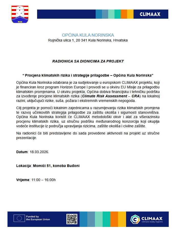 U Općini Kula Norinska u srijedu, 18. ožujka 2026. godine, održat će se radionica posvećena procjeni klimatskih rizika i strategijama prilagodbe klimatskim promjenama. Radionica počinje u 11 sati, a održat će se u Konobi Buđoni u Momićima.