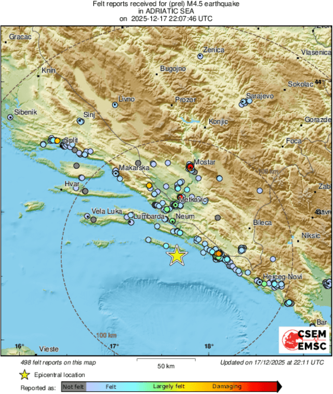 Prema prvim podacima EMSC-a magnituda potresa je iznosila 4.4 prema Richteru, a osjetio se u mnogim krajevima srednje i južne Dalmacije te Hercegovine, piše Dalmacija Danas.
