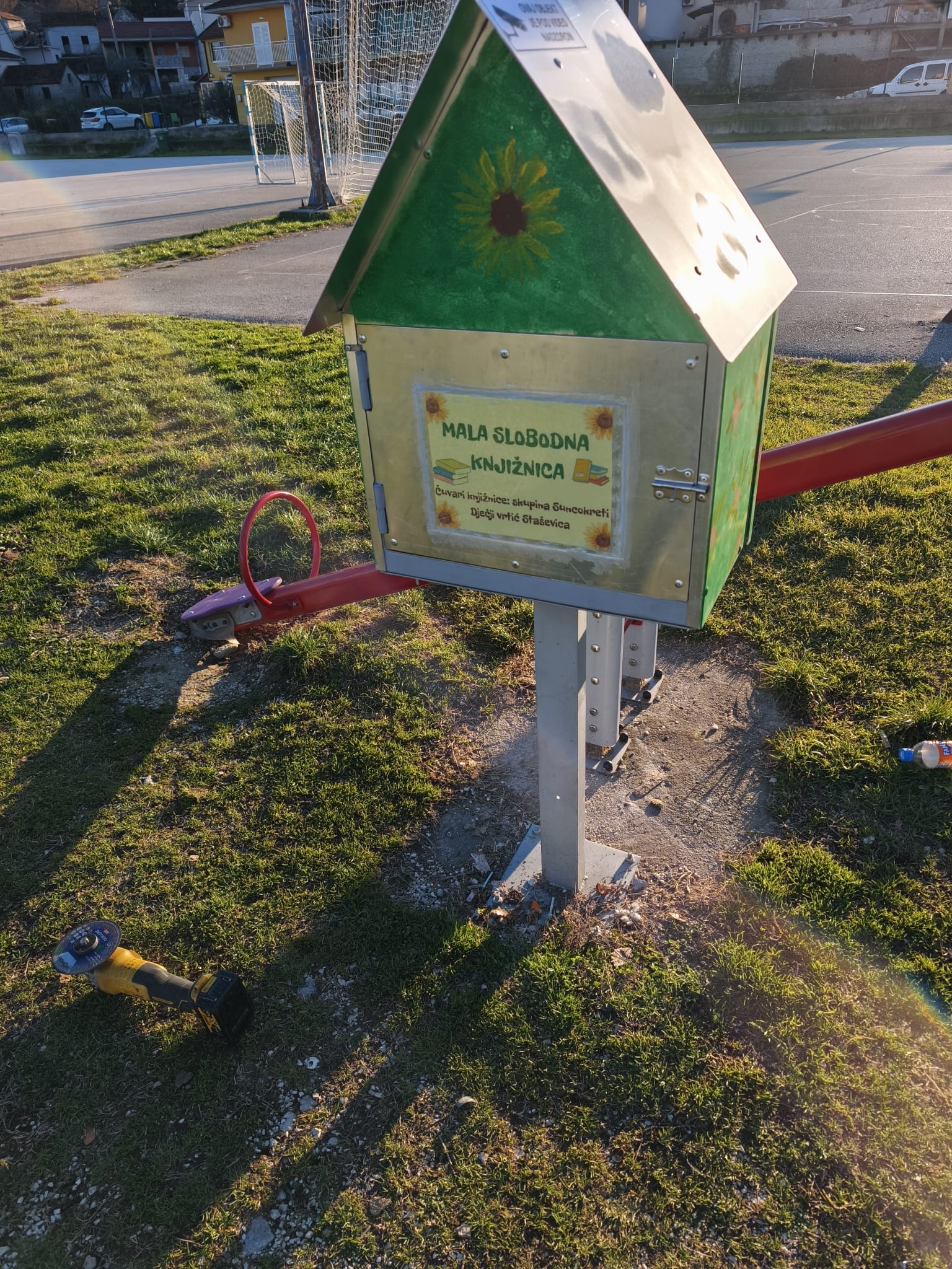 Nedavno je izrađena nova knjižnica, ovaj put aluminijska, koju su oslikala vrtićka djeca. Djeca su s nestrpljenjem čekala njezino postavljanje kako bi je mogli napuniti knjigama koje su pripremili. Kućica je postavljena u nedjelju, no već dan nakon uočeno je kako su u njoj pucane petarde, zbog čega je i oštećena. Djeca su upozorena da to ne čine, uz napomenu da je kućica pod video nadzorom i da se lako može utvrditi odgovornost.