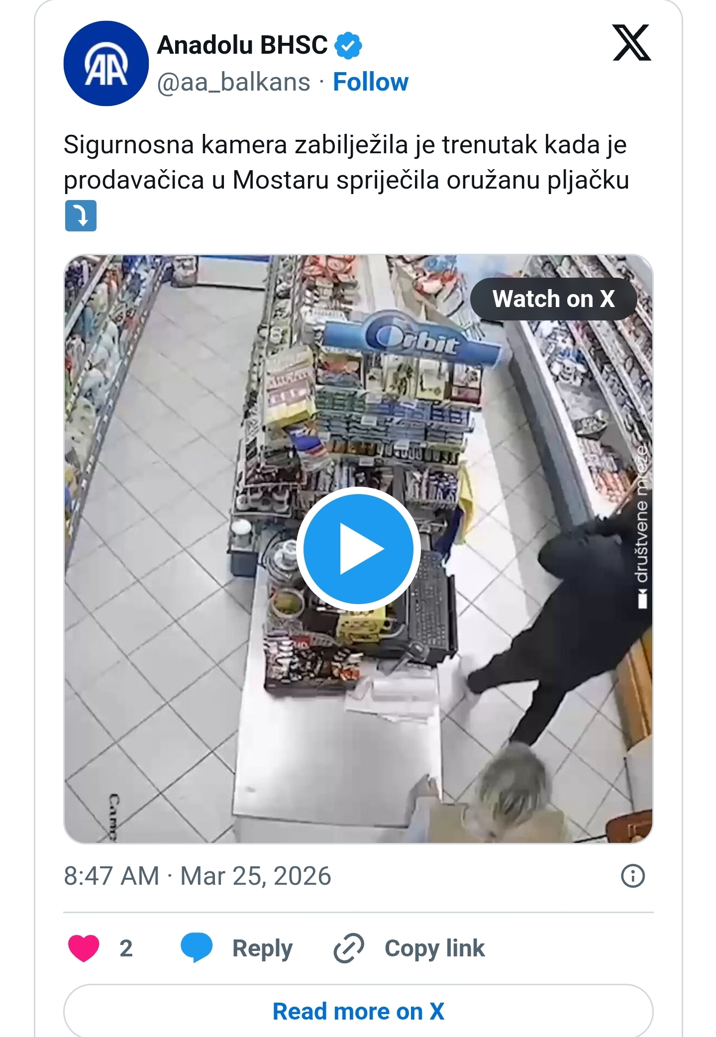 U mostarskom naselju Zalik sinoć oko 20 sati dogodio se pokušaj pljačke trgovine. Hrabra prodavačica uspjela je zaustaviti napadača koji je bio naoružan automatskom puškom.